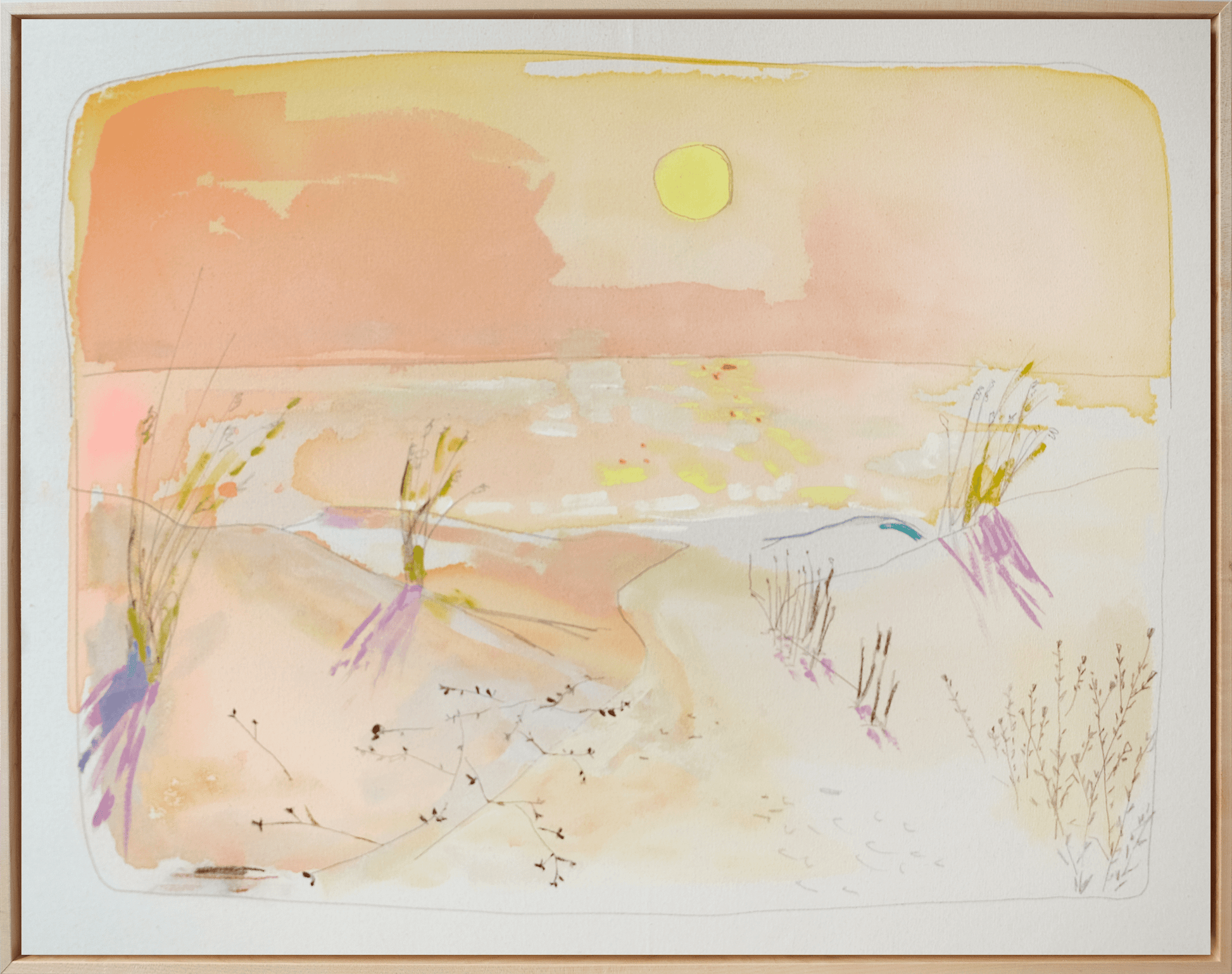 Acrylic, gouache and pastel on Natural Raw Canvas with an optional Maple Wood Floater frame