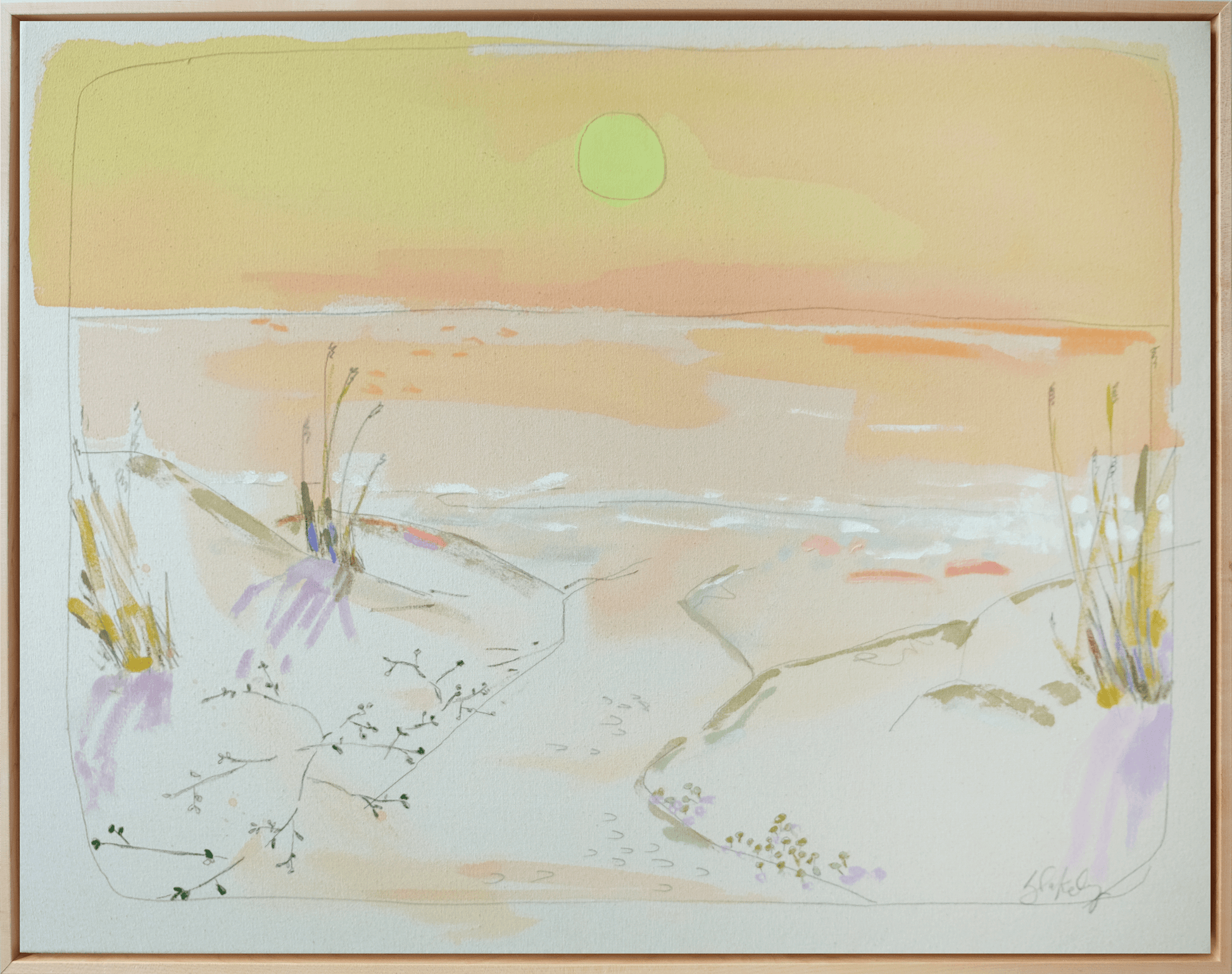 Acrylic, gouache and pastel on Natural Raw Canvas with an optional Maple Wood Floater frame