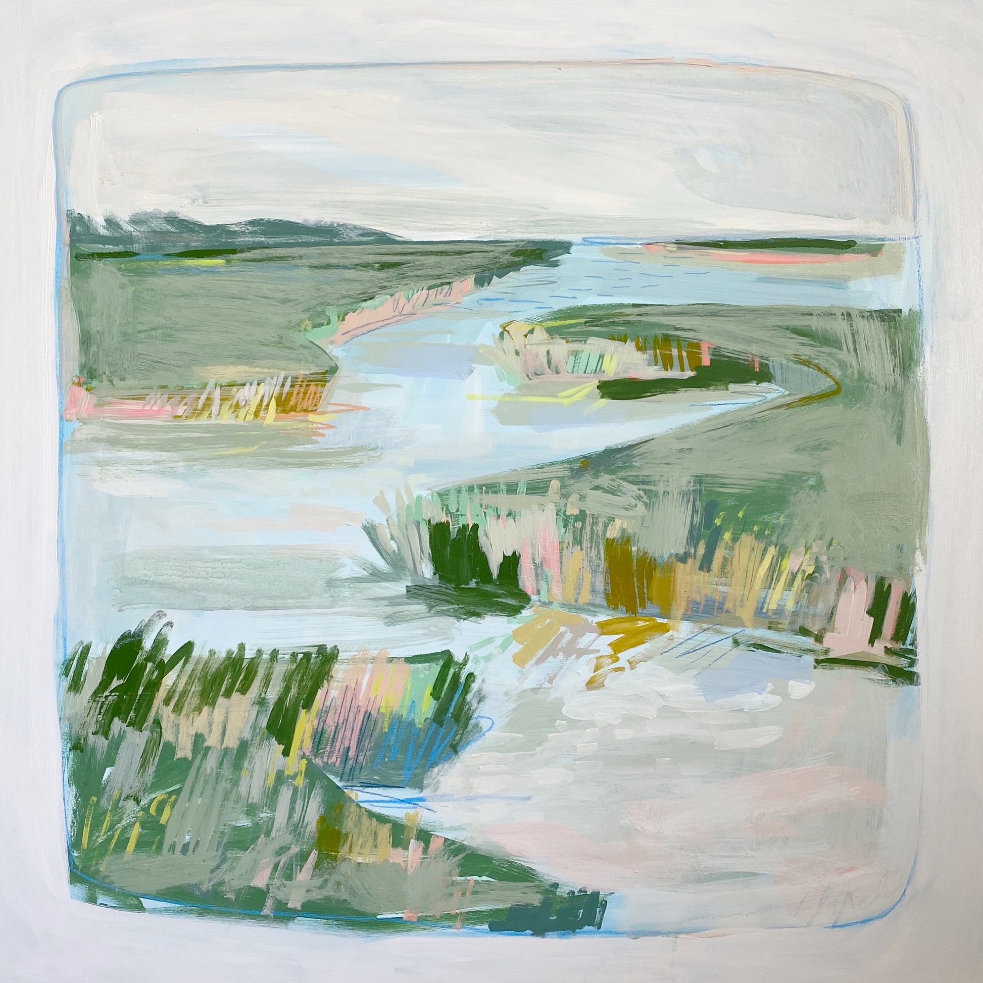 This piece is a part of Blakely's 2019 Summer Marsh Collection. It is has a depth of 2 inches that is painted beige, to match the border. This piece will be hand signed by Blakely and shipped via UPS from Charleston, SC within two weeks of purchase. Free shipping in the US, additional costs for shipping internationally.