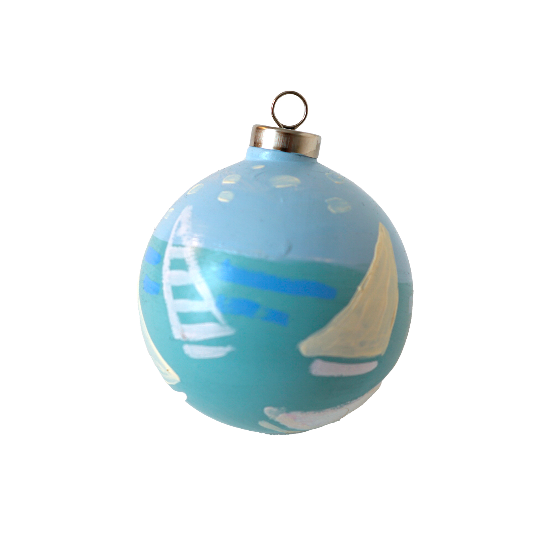 This ornament was hand-painted by Blakely on a glass Christmas ball with acrylic paint. Each ornament is tied with a velvet ribbon.