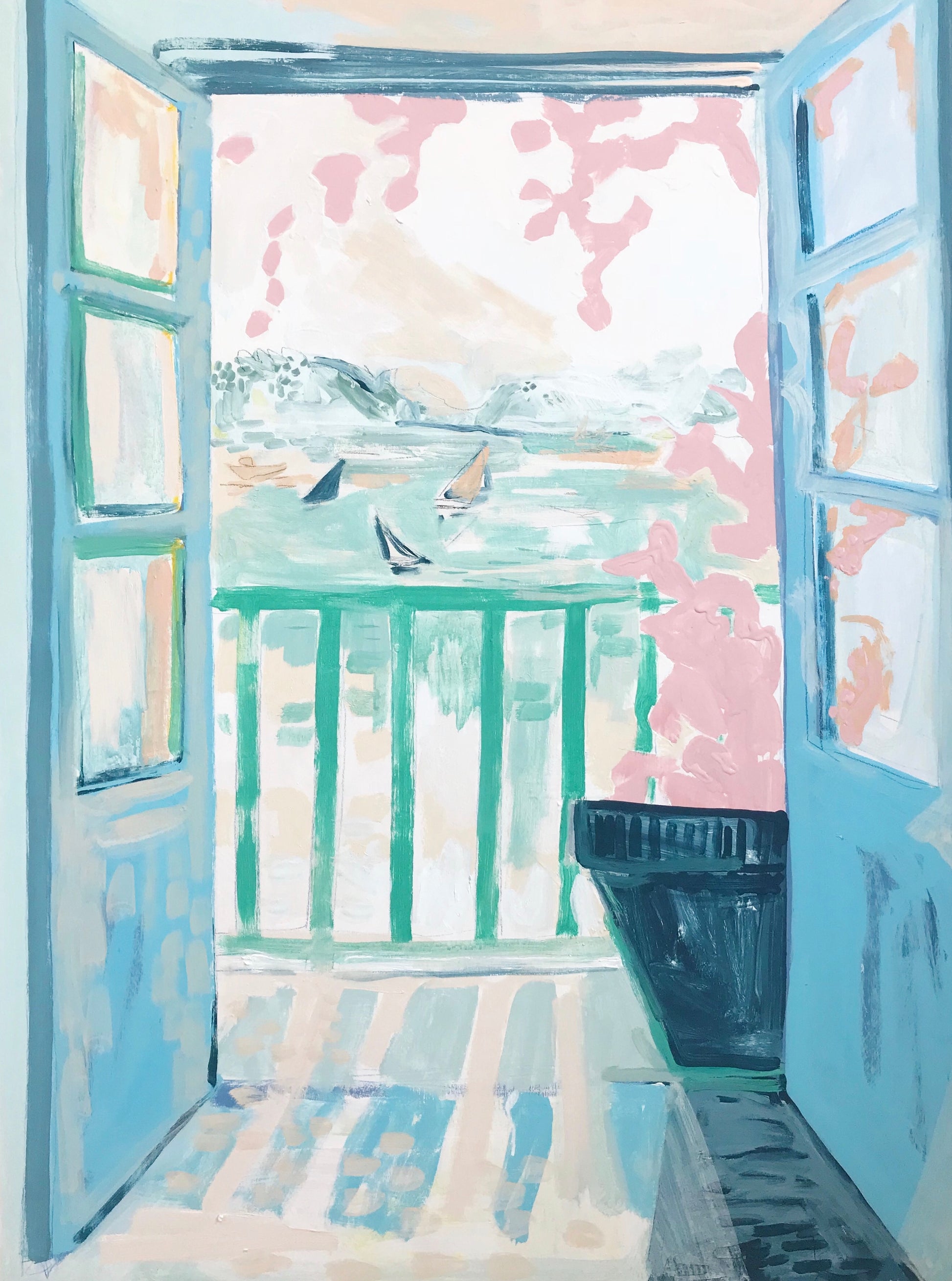 This piece is part of the collection, 'The Color of Home.' It depicts life by the coast through bold brush strokes, pattern, and blocks of color. This piece is ready to hang and has a two inch depth that will be painted white. This piece will be shipped from Charleston, SC via UPS.