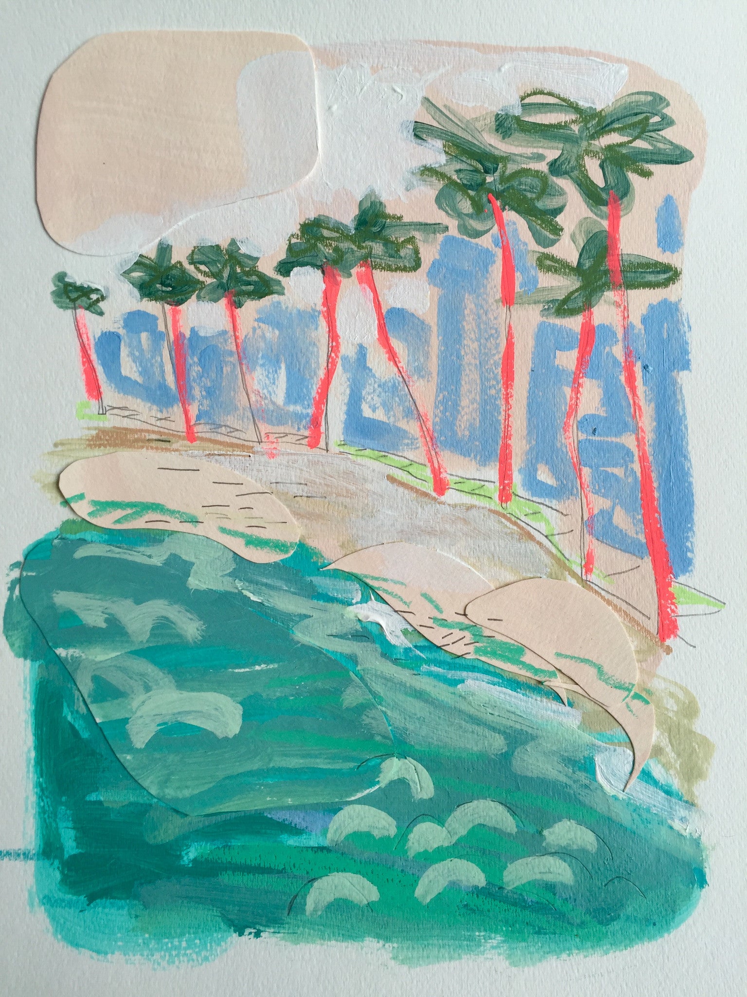 This piece is done on water color paper with acrylic paint, crayon, pencil, and layers of paper. I was very inspired during my trip down the coast of California, but felt that I needed to expand from my normal paintings to capture it's spunk. This piece will be shipped from Charleston, SC in a flat cardboard box. It is a standard size, so you can buy or order a frame with out having to do a custom one.