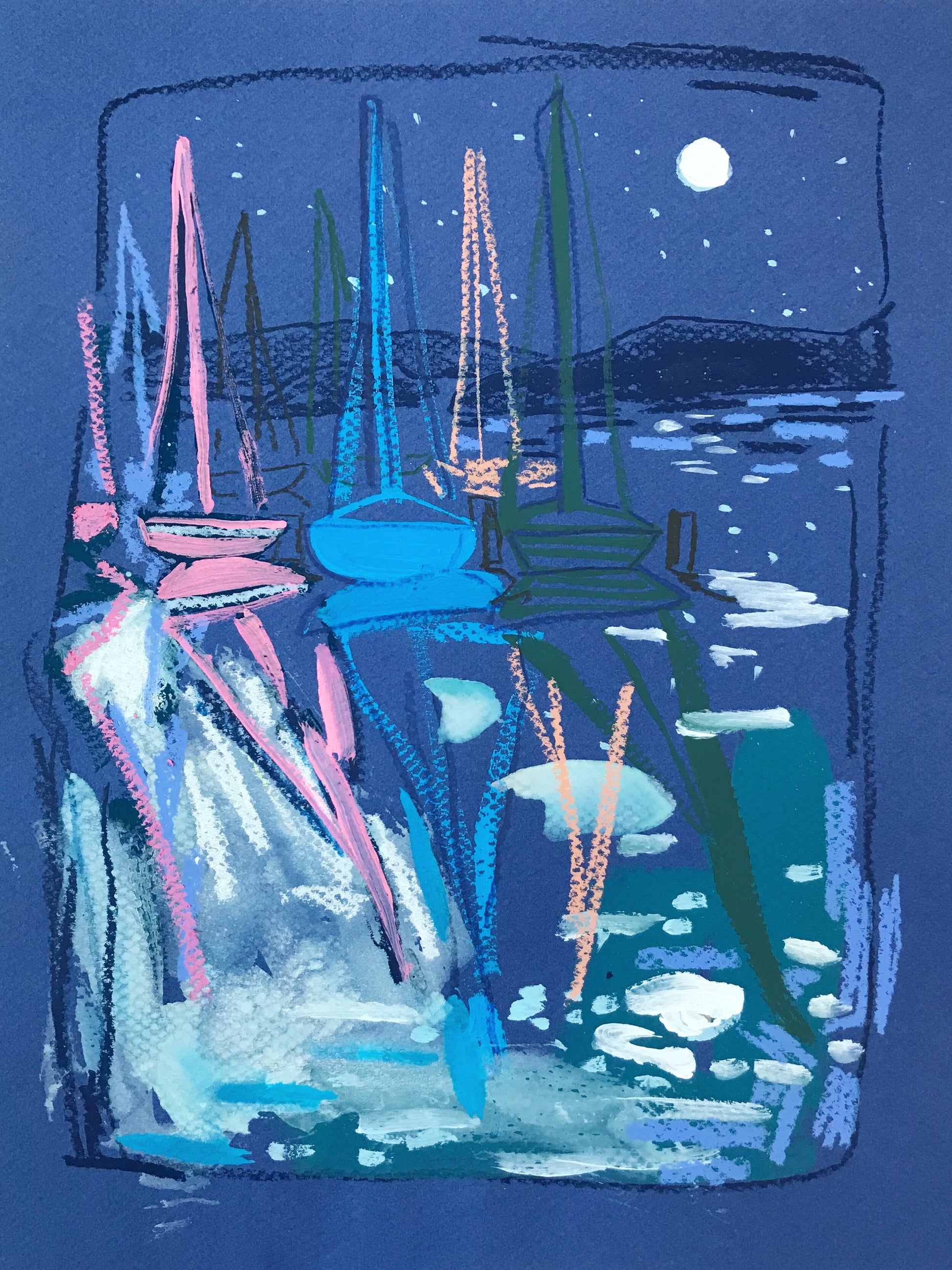 This piece is gouache, acrylic paint, pencil, and pastel on royal blue paper. It will be sold unframed, and hand signed by Blakely. Piece will ship from Charleston, SC via UPS.