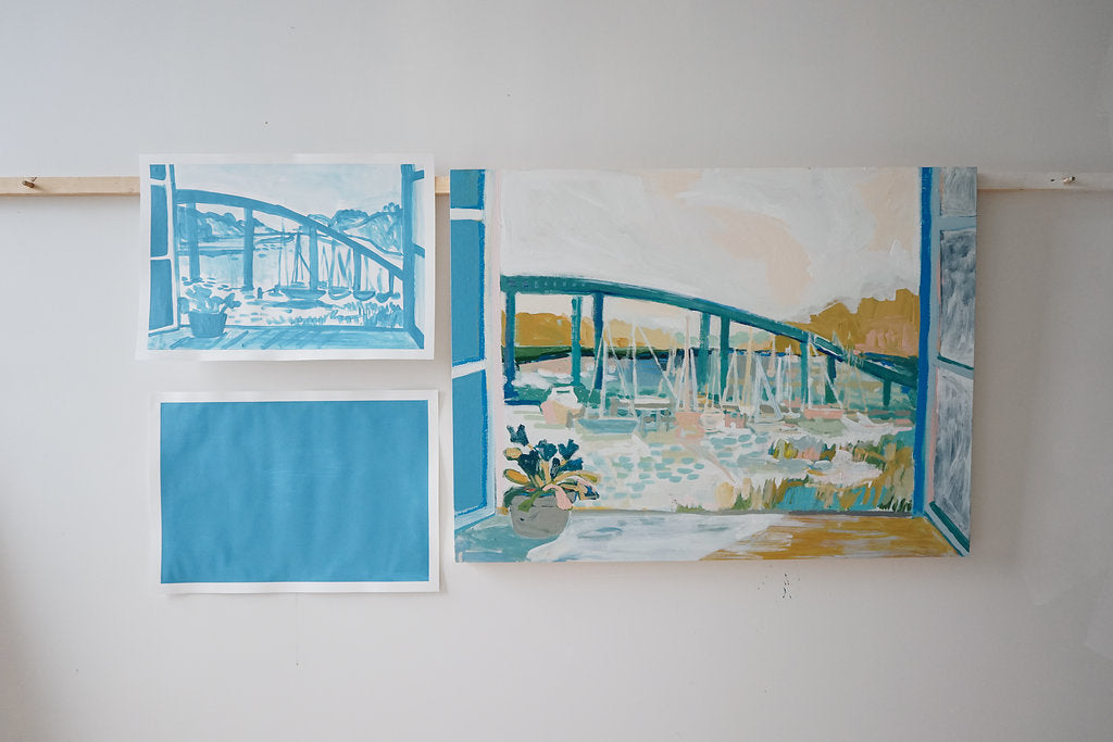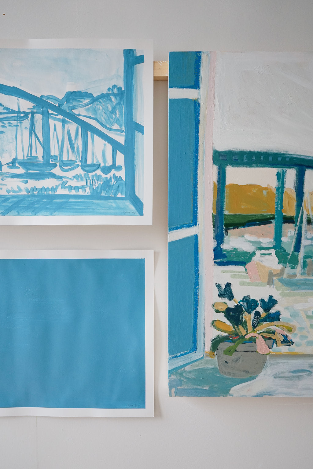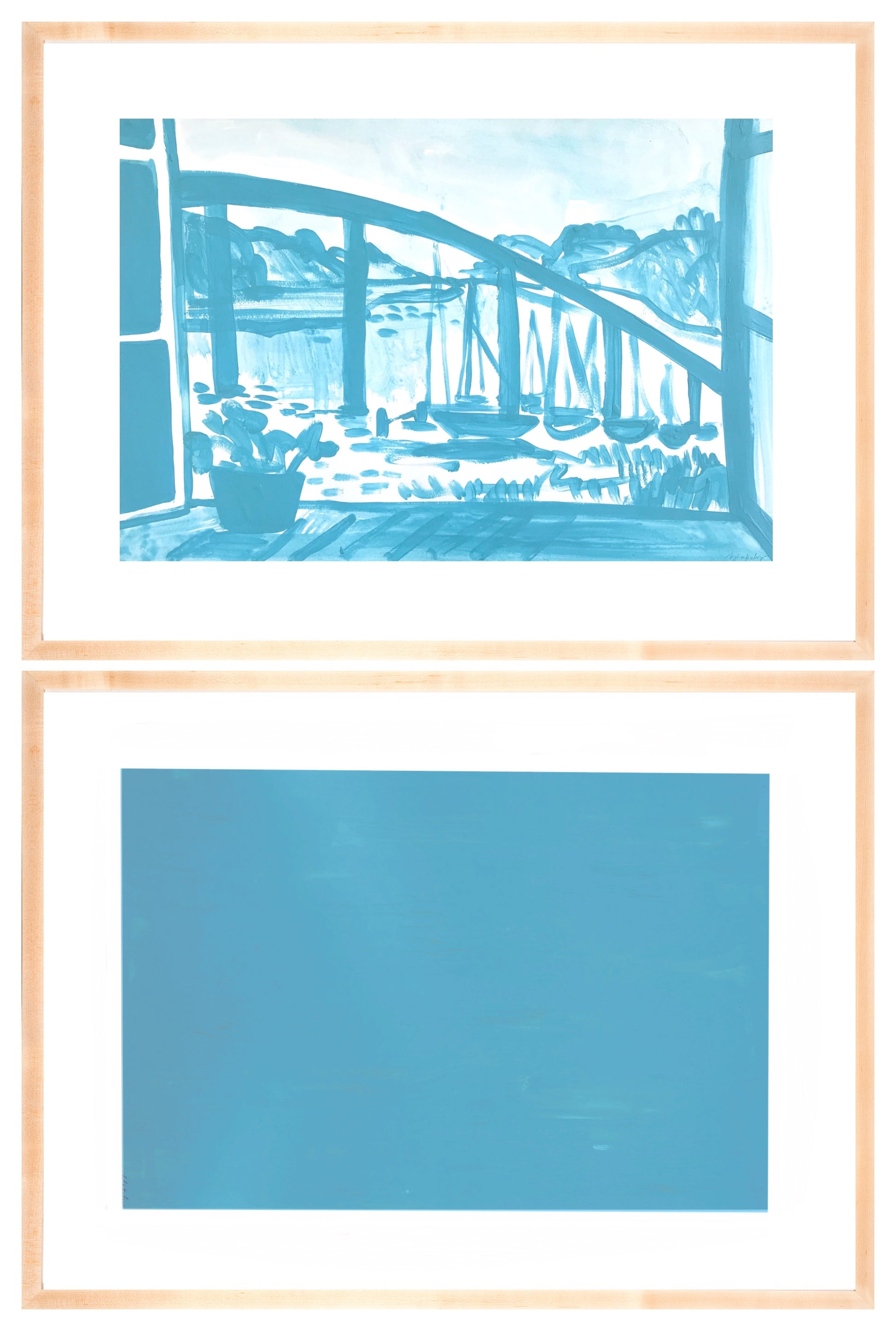 This piece is painted with all Farrow & Ball paint in the color St. Giles Blue. On the top, a monochromatic coastal scene, on the bottom a contemporary block of color. It is part of the collection, 'The Color of Home' which depicts life by the coast through bold brush strokes, pattern, and blocks of color. This piece will be shipped from Charleston, SC via UPS.