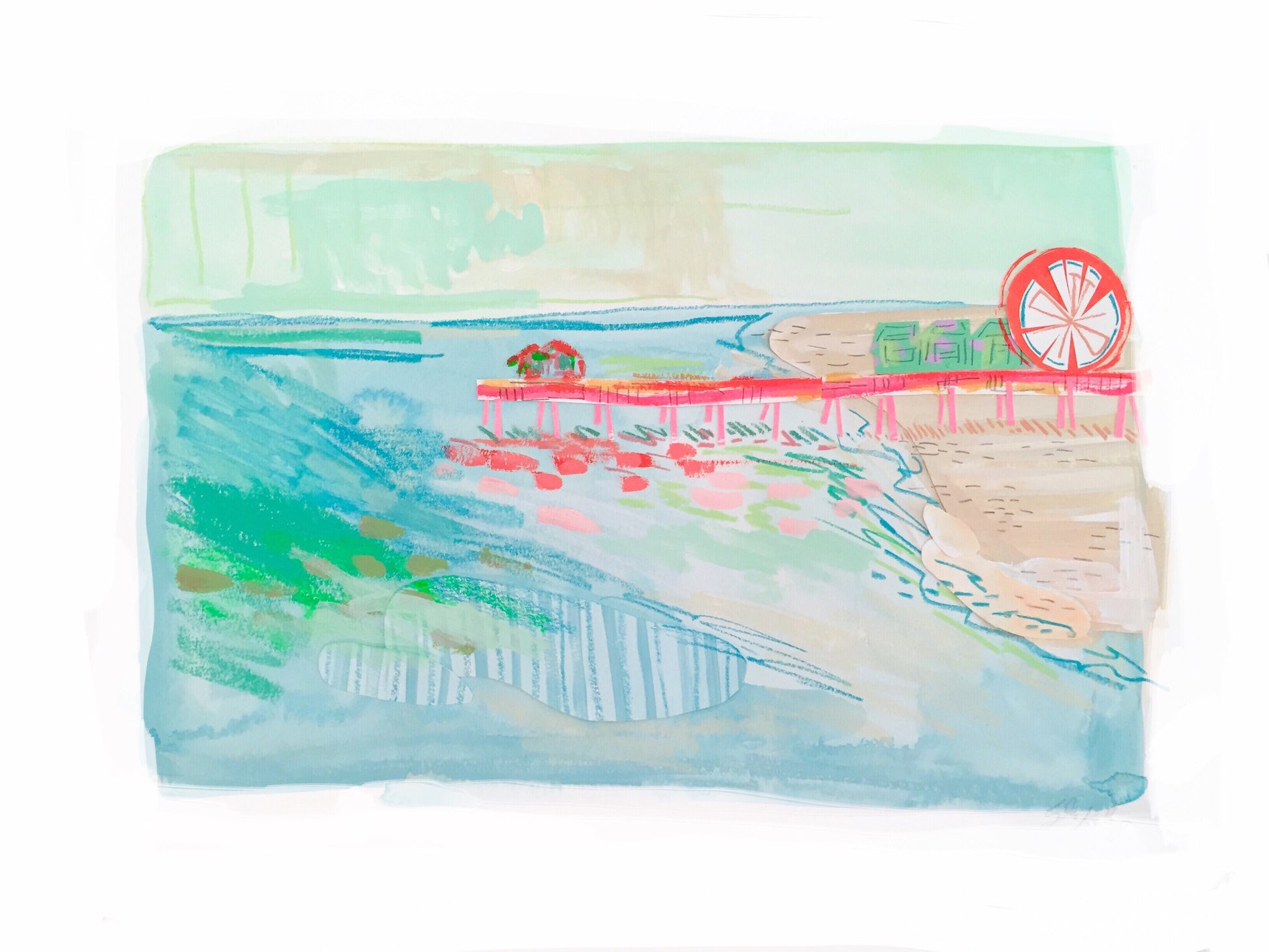 This piece is done on water color paper with acrylic paint, crayon, pencil, and layers of paper. I was very inspired during my trip down the coast of California, but felt that I needed to expand from my normal paintings to capture it's spunk. This piece will be shipped from Charleston, SC in a flat cardboard box. It is a standard size, so you can buy or order a frame with out having to do a custom one.