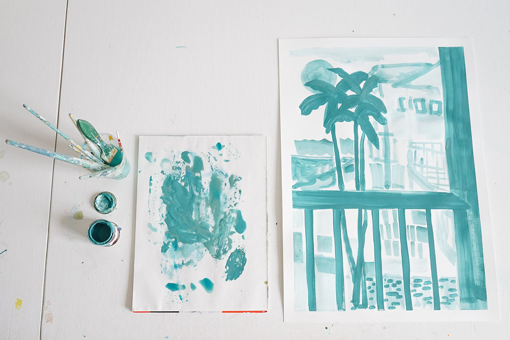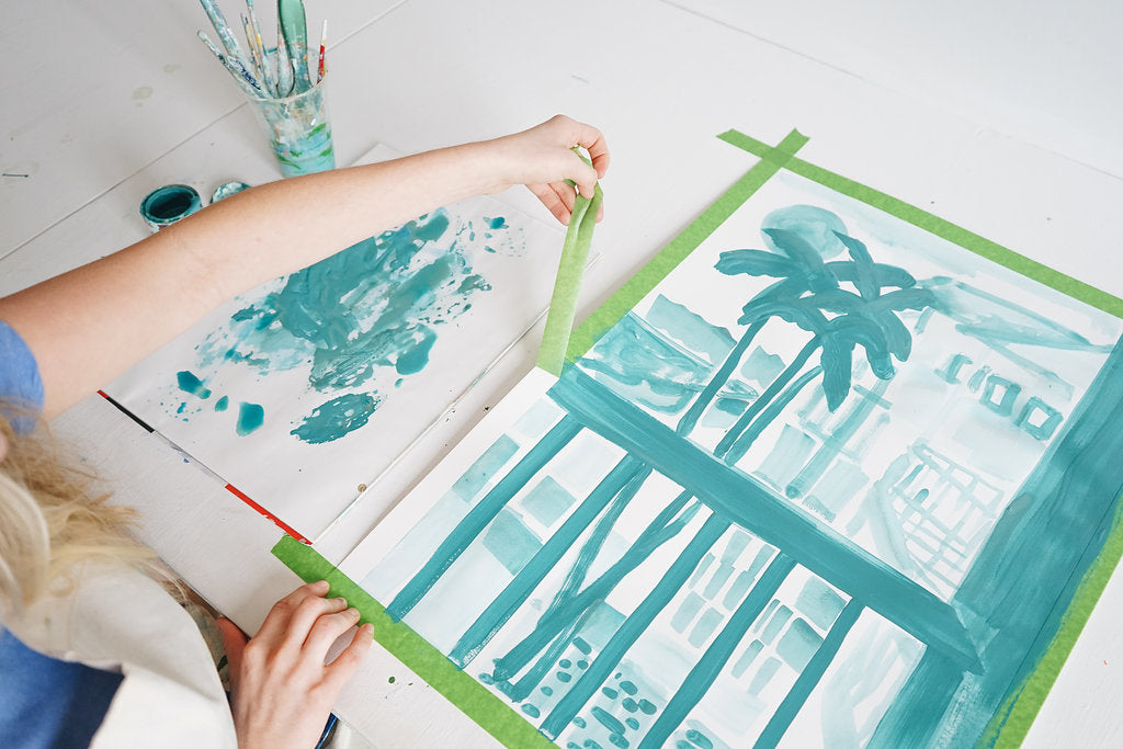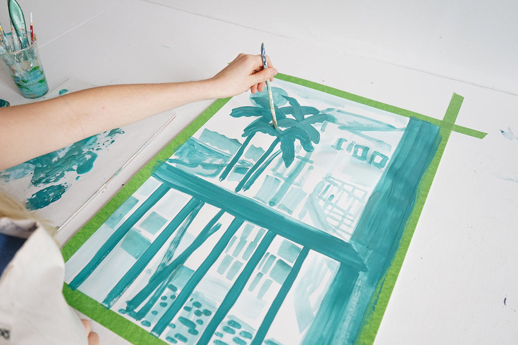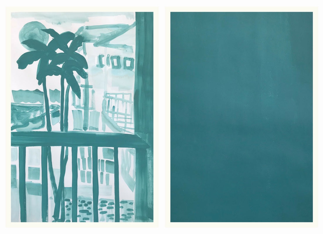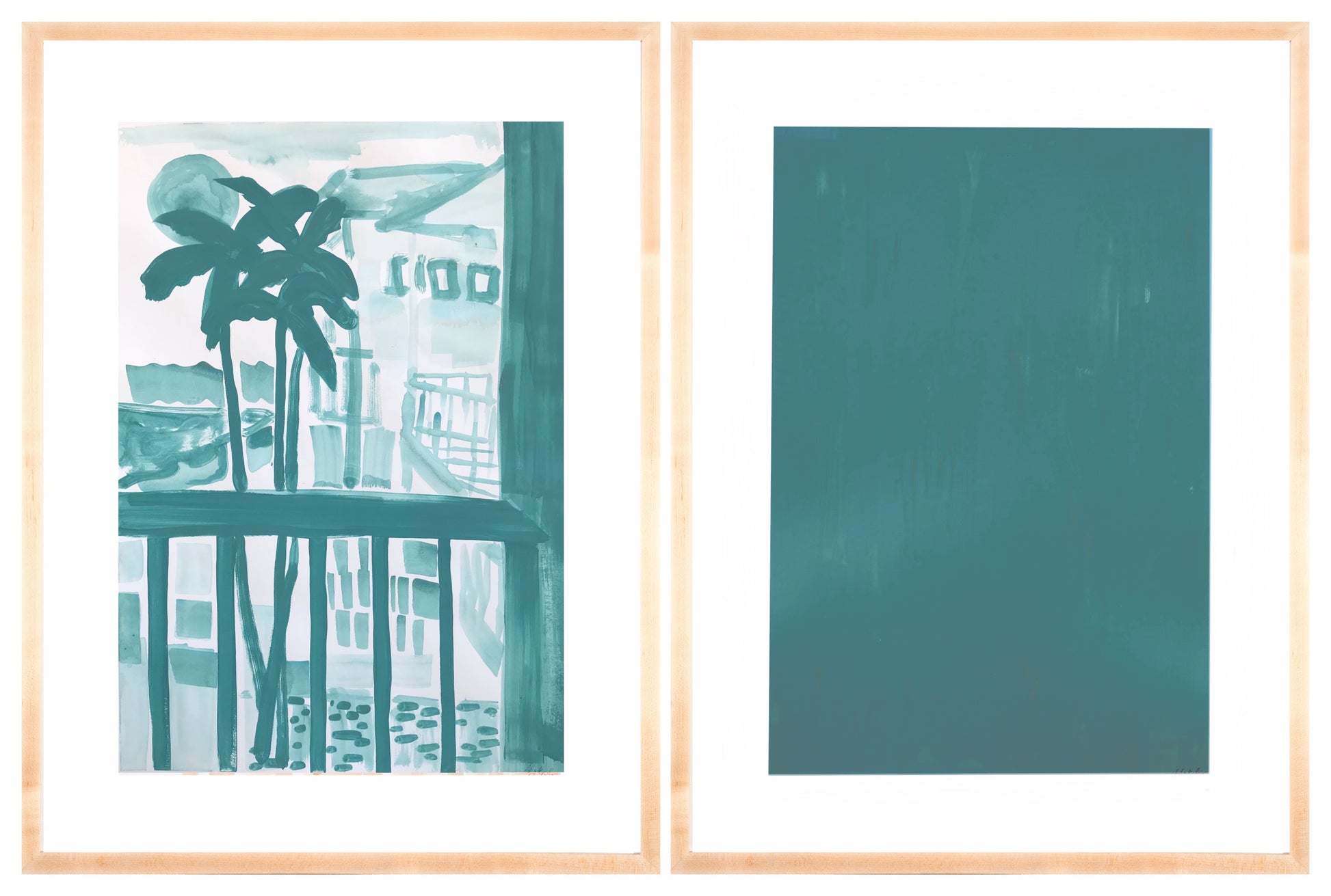 This piece is painted with all Farrow & Ball paint in the color Vardo. On the left, a monochromatic coastal scene, on the right a contemporary block of color. It is part of the collection, 'The Color of Home' which depicts life by the coast through bold brush strokes, pattern, and blocks of color. This piece will be shipped from Charleston, SC via UPS.