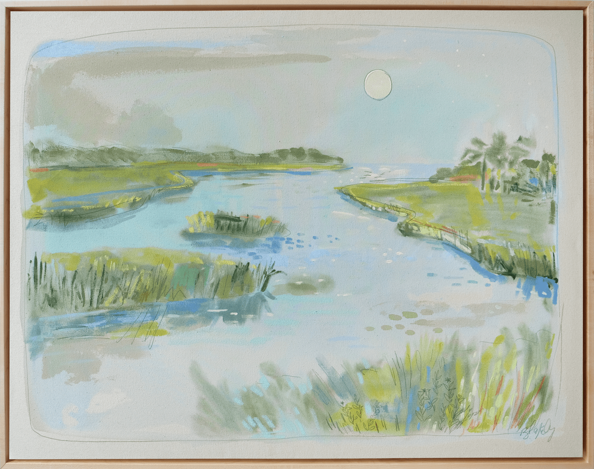 Acrylic, gouache and pastel on Natural Raw Canvas with an optional Maple Wood Floater frame