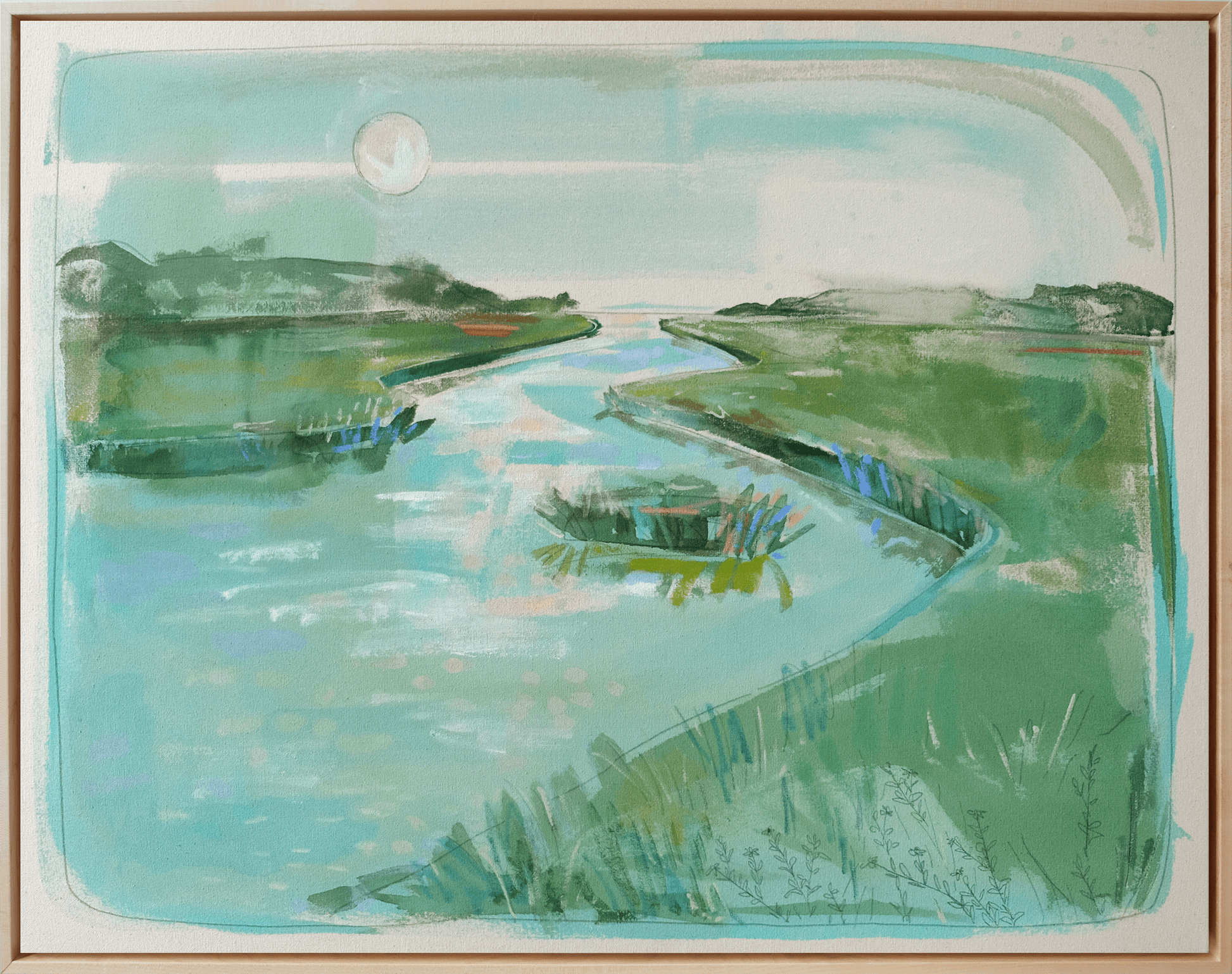 Acrylic, gouache and pastel on Natural Raw Canvas with an optional Maple Wood Floater frame