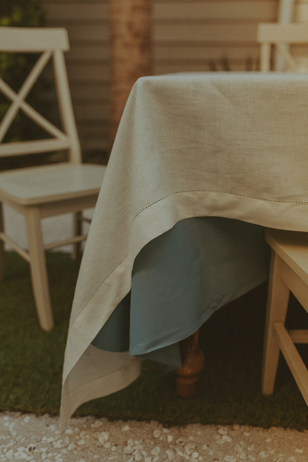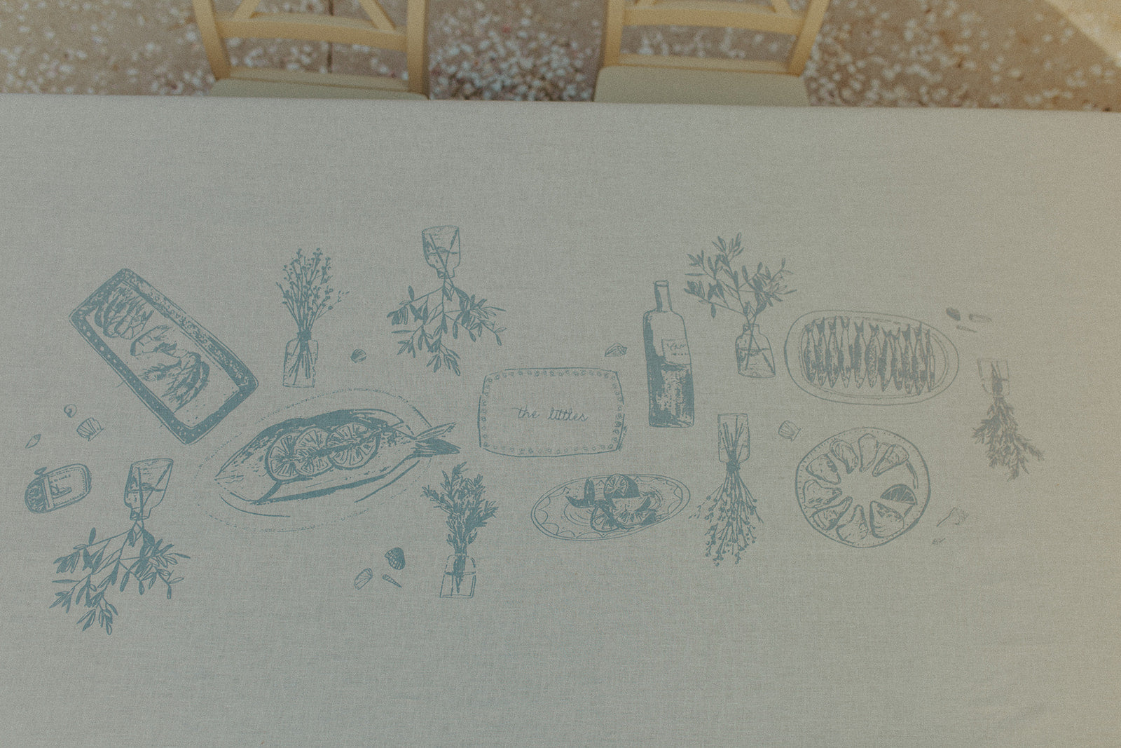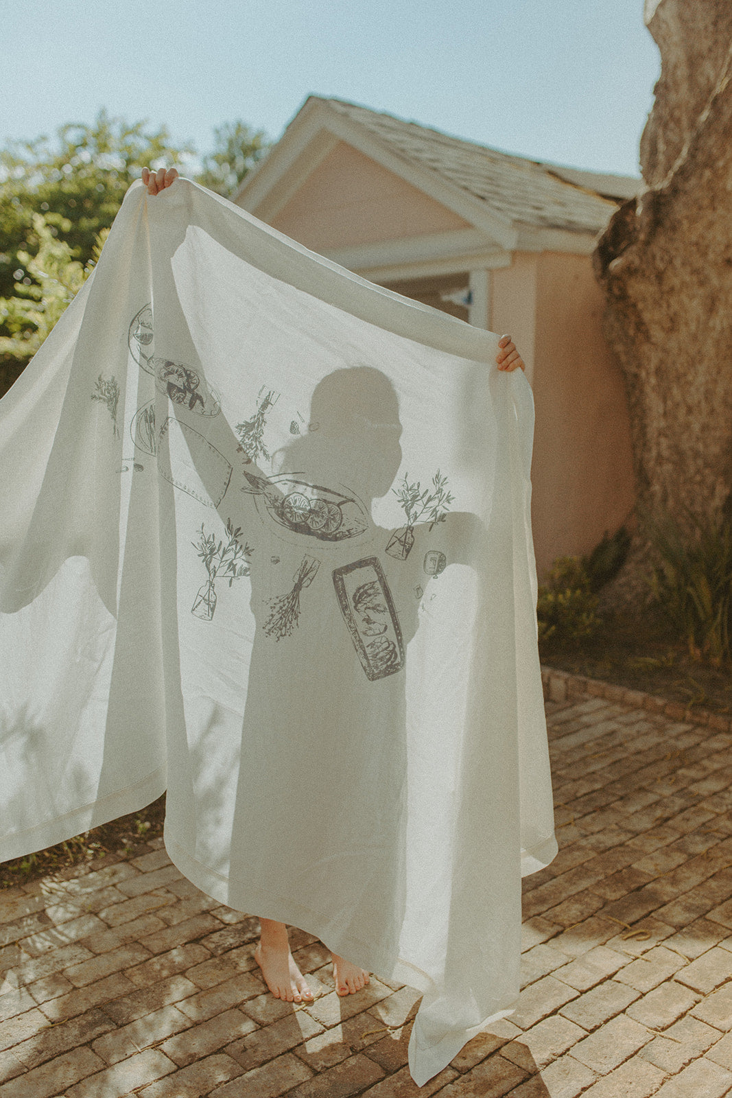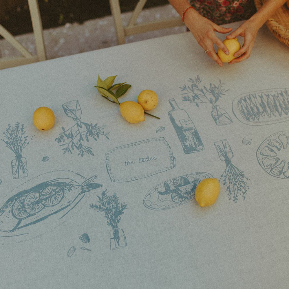 Inspired by Blakely's "Al Fresco" series, this limited edition screen printed tablecloth adds the perfect touch to any spread. The design features Blakely's drawings of oysters, fish, lemons and florals. With the option for custom embroidery, this heirloom piece can be personalized and treasured for many years to come.