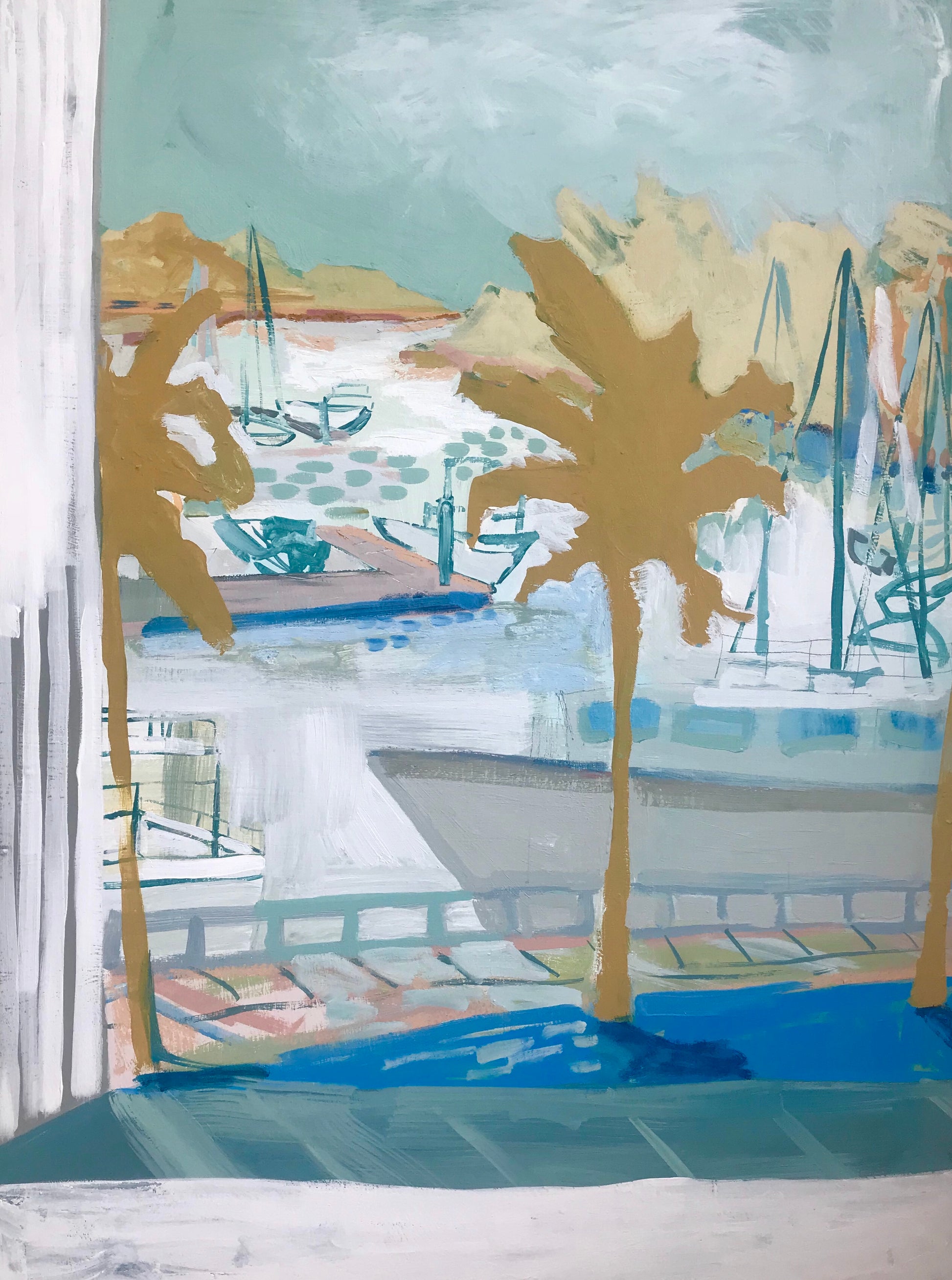This piece is part of the collection, 'The Color of Home.' It depicts life by the coast through bold brush strokes, pattern, and blocks of color. This piece is ready to hang and has a two inch depth that will be painted white. This piece will be shipped from Charleston, SC via UPS.