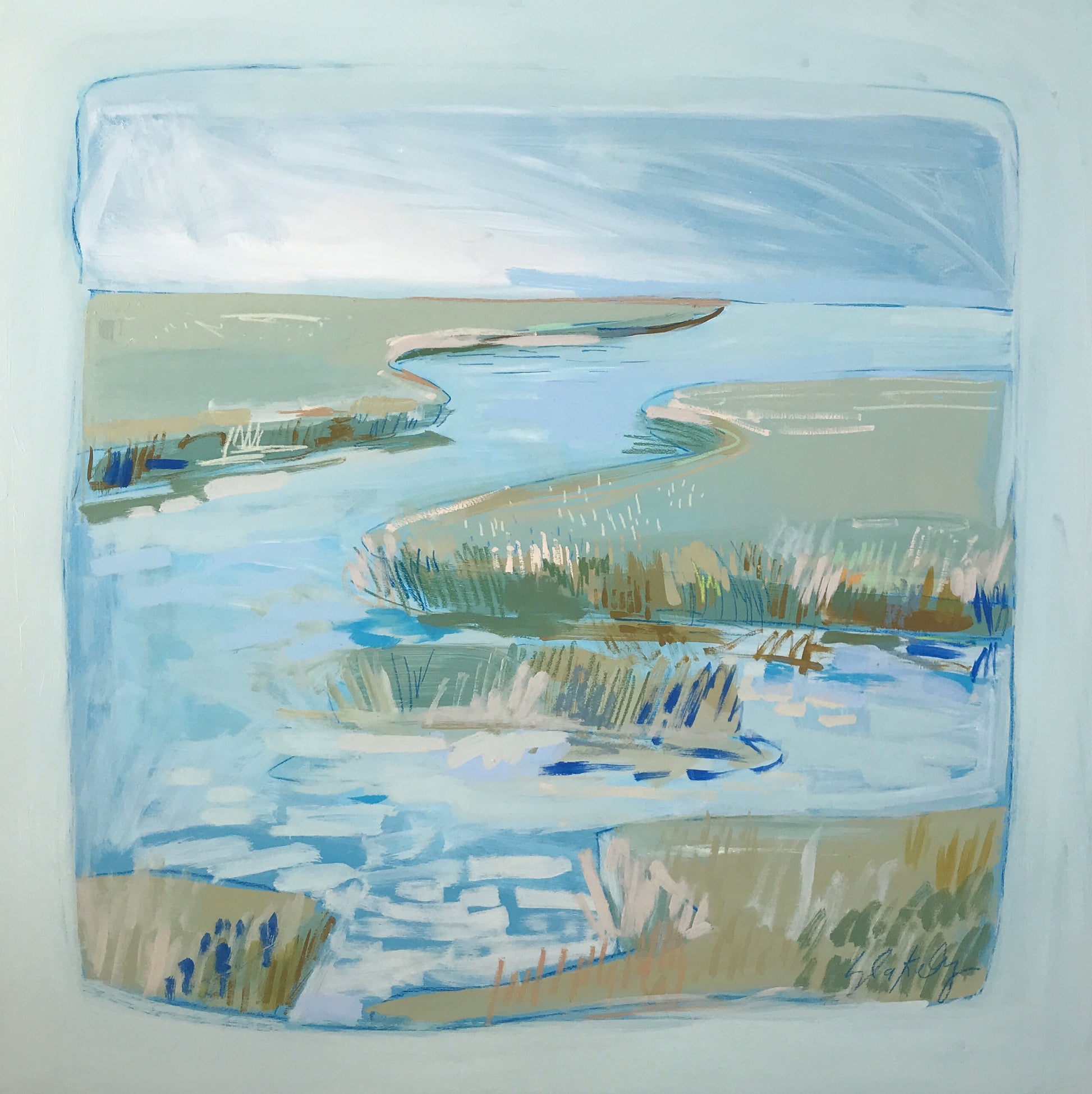 This piece is a part of Blakely's 2019 Summer Marsh Collection. It is has a depth of 2 inches that is painted bright blue, to match the border. This piece will be hand signed by Blakely and shipped via UPS from Charleston, SC within two weeks of purchase. Free shipping in the US, additional costs for shipping internationally.