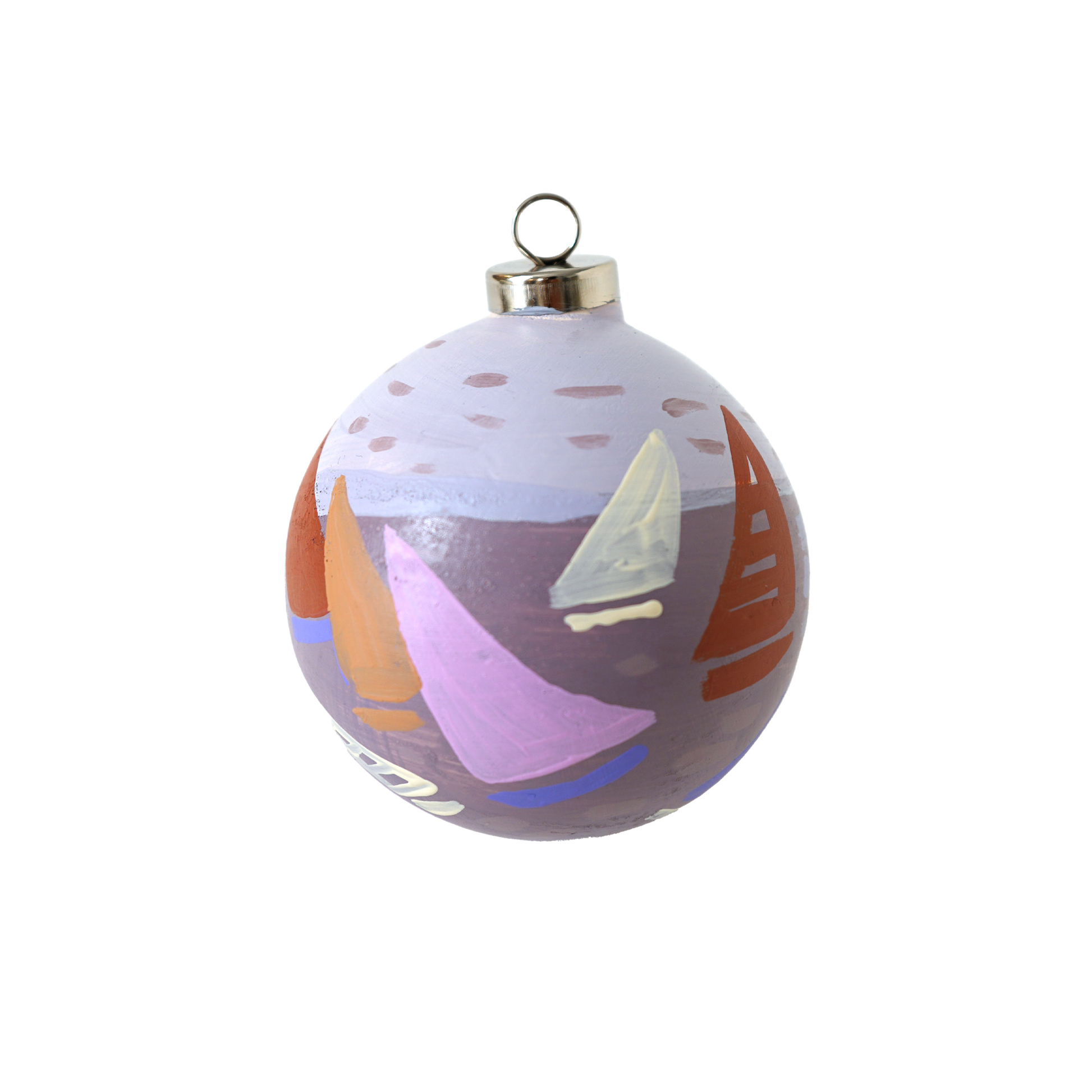 This ornament was hand-painted by Blakely on a glass Christmas ball with acrylic paint. Each ornament is tied with a velvet ribbon.