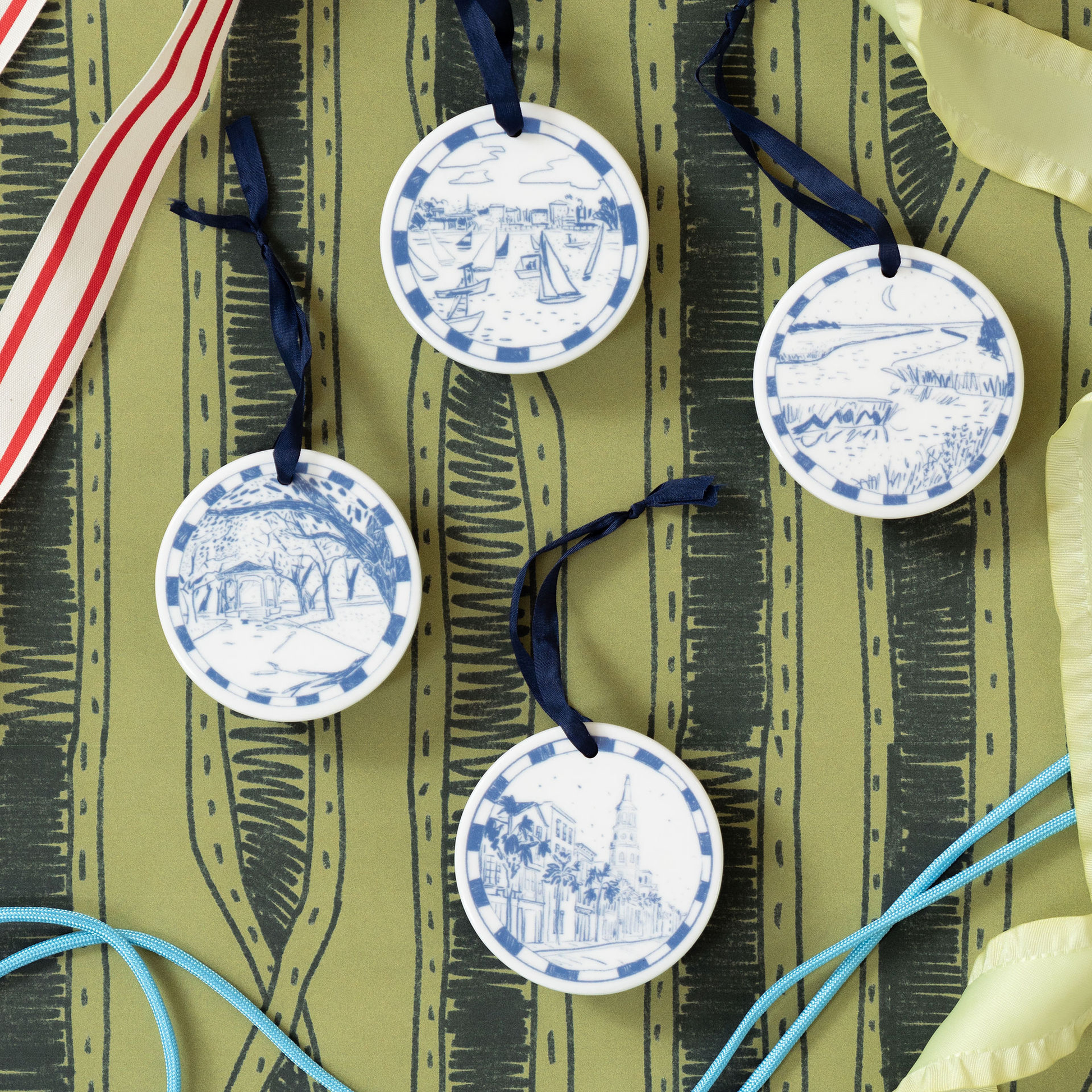 These ornaments were printed from original Blakely drawings. Each set of ornaments will be shipping from Charleston, SC.