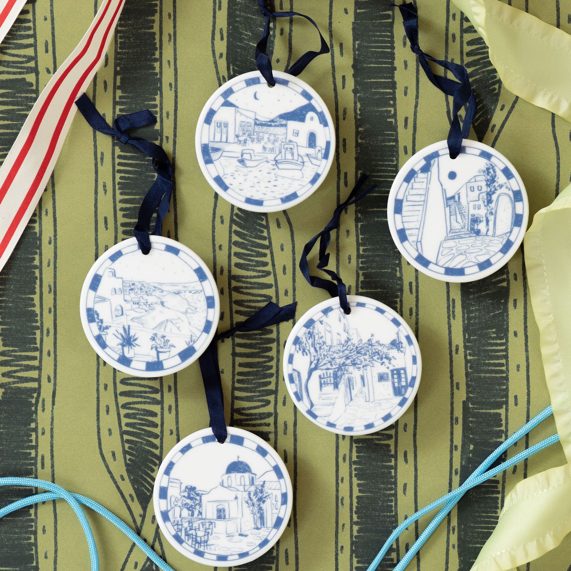 These illustrated ornaments are returning to the Holiday Shoppe from last holiday season at a discounted rate. There are three limited edition sets of ceramic ornaments depicting Charleston, Greece and Italy. Each ornament is tied with a hand-dyed silk ribbon.