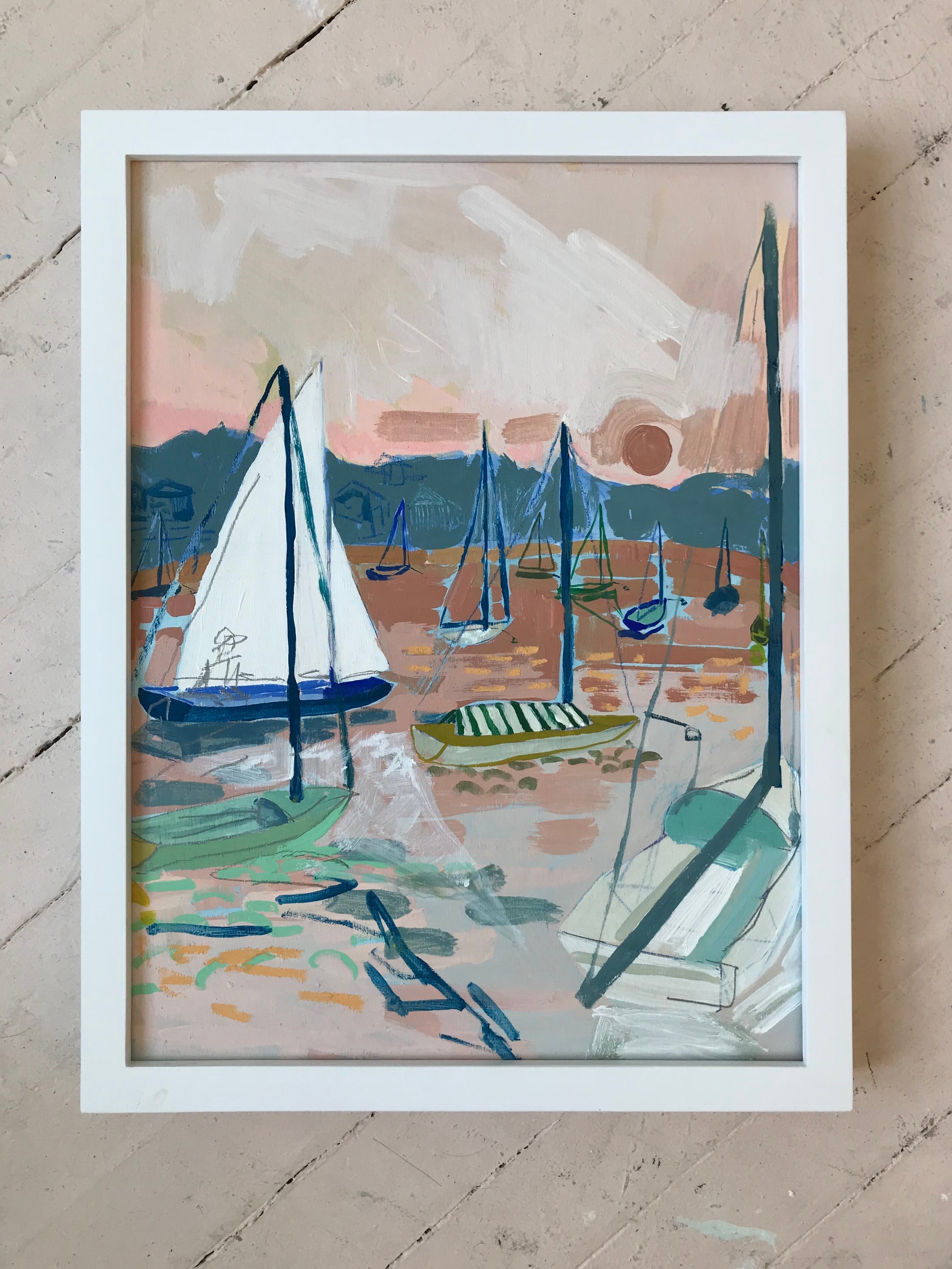 As Blakely traveled this past summer, she kept a sketchbook as a journal to document all the colors she was seeing. This piece was created based off these sketchbook paintings.This 12x16 on a flat piece of wood, and is available plain, or in a white frame like the second image. It is signed by Blakely and will be shipped from Charleston, SC via UPS.
