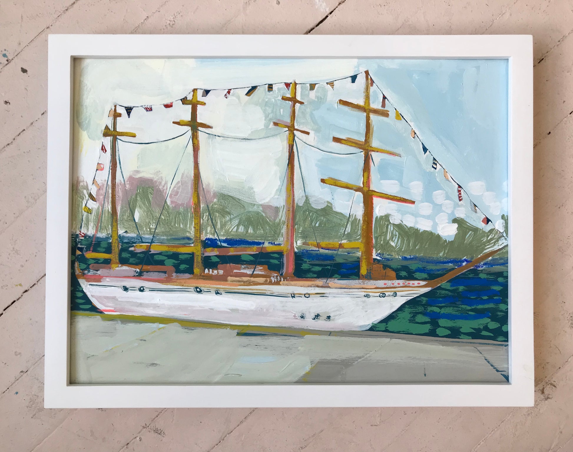 As Blakely traveled this past summer, she kept a sketchbook as a journal to document all the colors she was seeing. This piece was created based off these sketchbook paintings.This 12x16 on a flat piece of wood, and is available plain, or in a white frame like the second image. It is signed by Blakely and will be shipped from Charleston, SC via UPS.