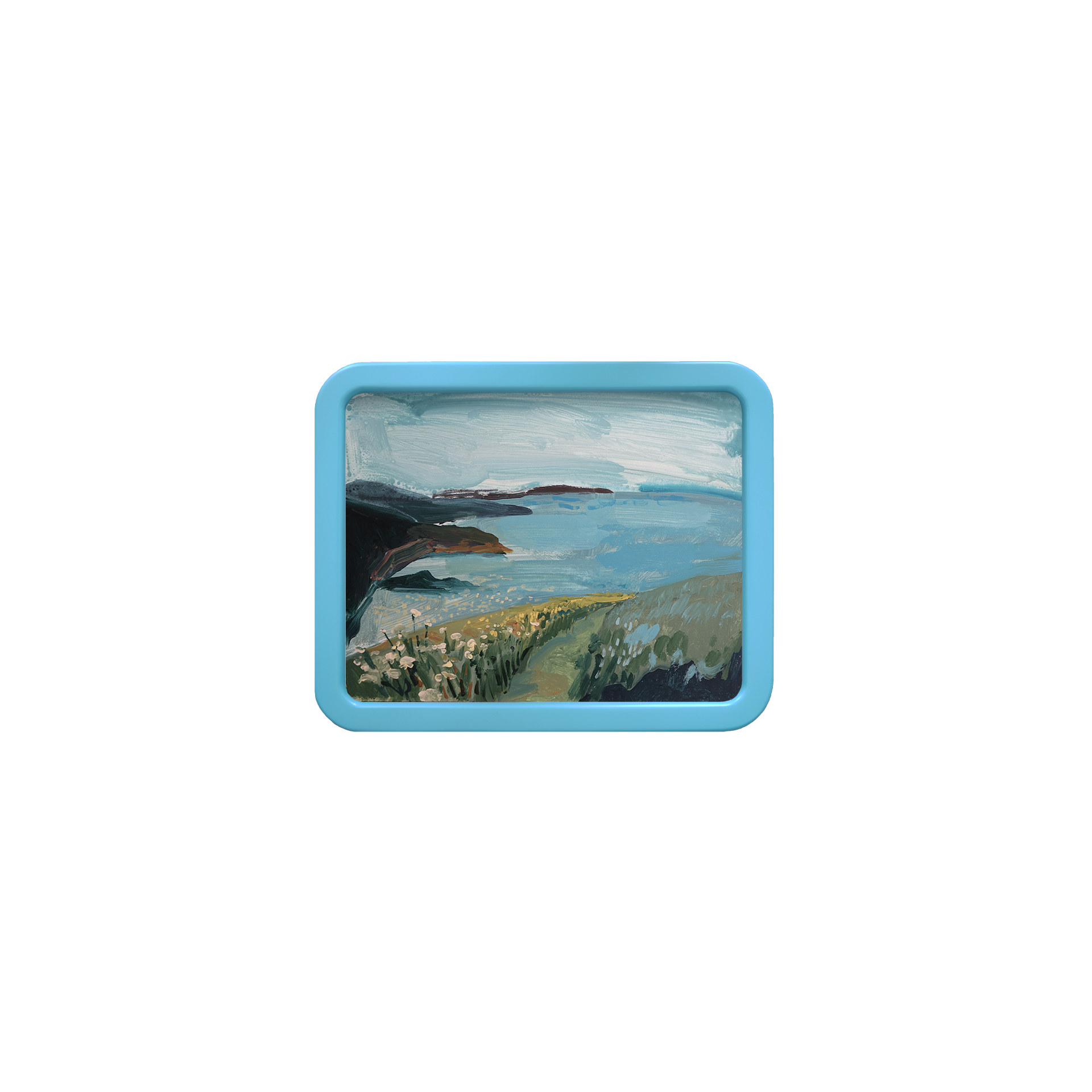 Acrylic on flat masonite panel with an optional blue rounded-corner frame