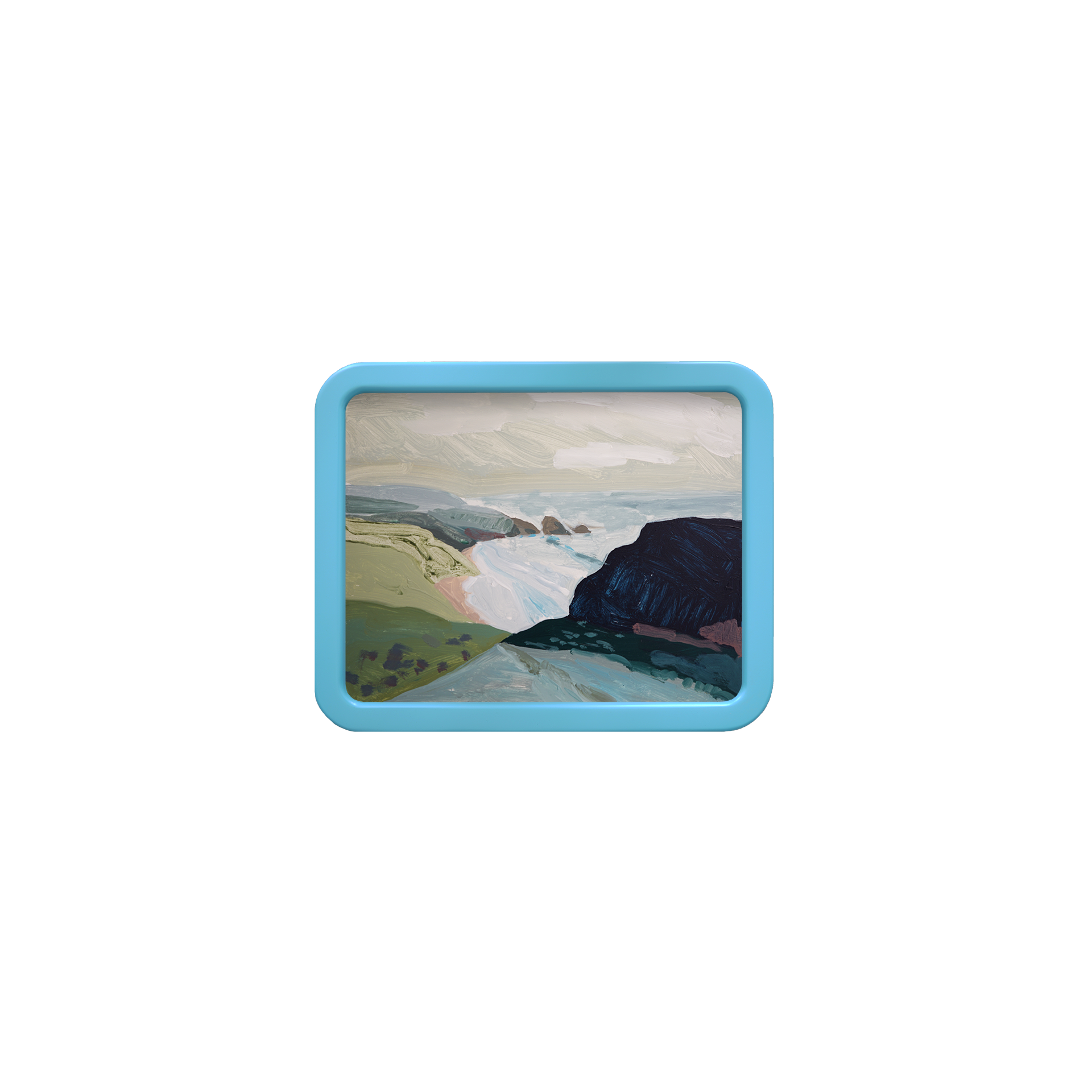 Acrylic on flat masonite panel with an optional blue rounded-corner frame
