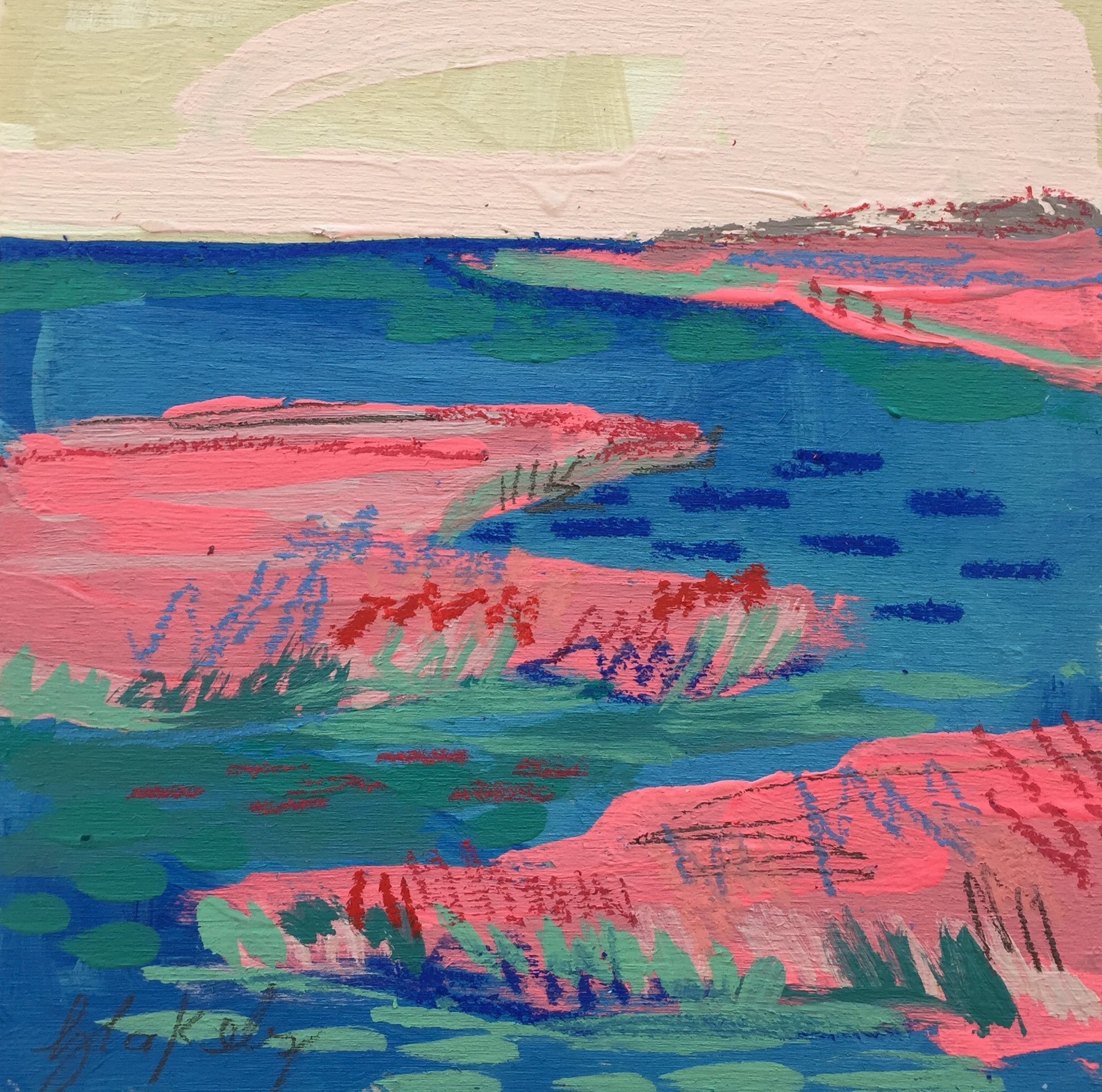 This piece is an original marsh painting from August 2016. It is made with acrylic paint, neocolor crayons, pencil, and oil pastel on a birch wood panel. The sides have a two inch depth and will be painted white. It is signed by the artist and will be shipped from Charleston, SC via UPS.