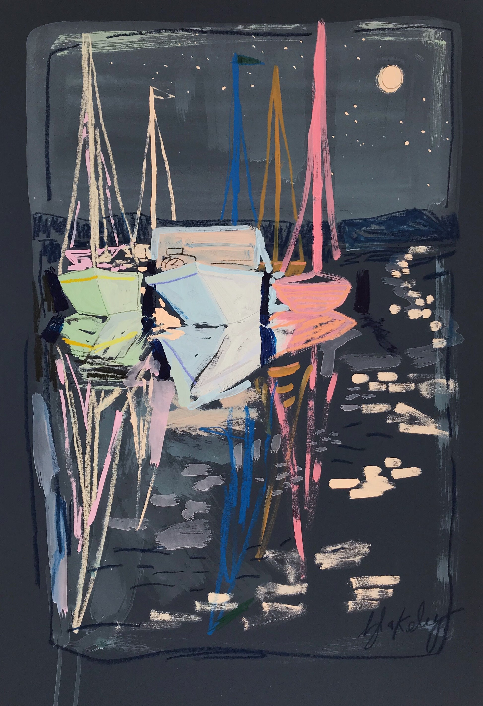 Acrylic, gouache, pencil, pastel and crayon on navy paper.