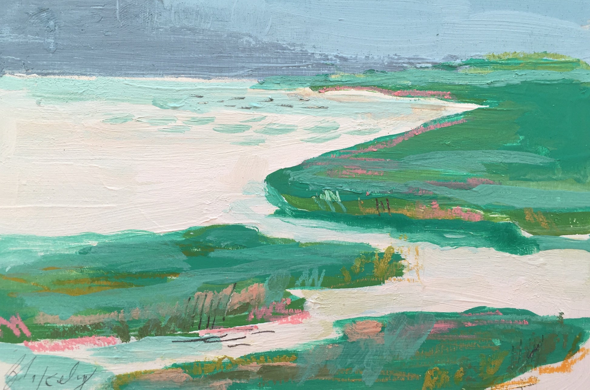 This piece is an original marsh painting from August 2016. It is made with acrylic paint, neocolor crayons, pencil, and oil pastel on a birch wood panel. The sides have a two inch depth and will be painted white. It is signed by the artist and will be shipped from Charleston, SC via UPS.