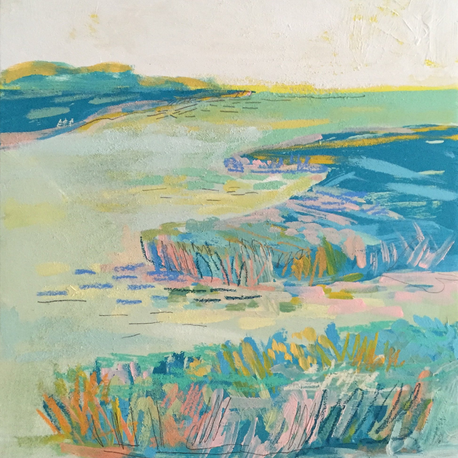 This piece is an original marsh painting from August 2016. It is made with acrylic paint, neocolor crayons, pencil, and oil pastel on a birch wood panel. The sides have a two inch depth and will be painted white. It is signed by the artist and will be shipped from Charleston, SC via UPS.