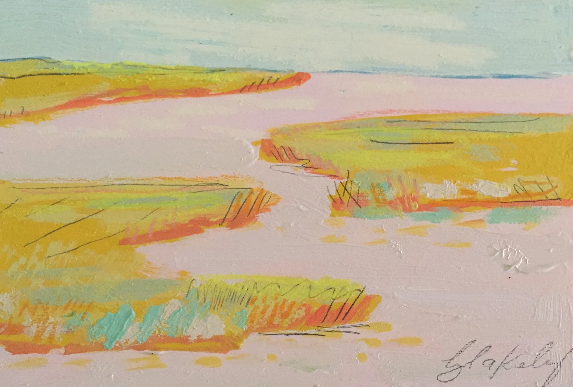 This piece is an original marsh painting from August 2016. It is made with acrylic paint, neocolor crayons, pencil, and oil pastel on a birch wood panel. The sides have a two inch depth and will be painted white. It is signed by the artist and will be shipped from Charleston, SC via UPS.