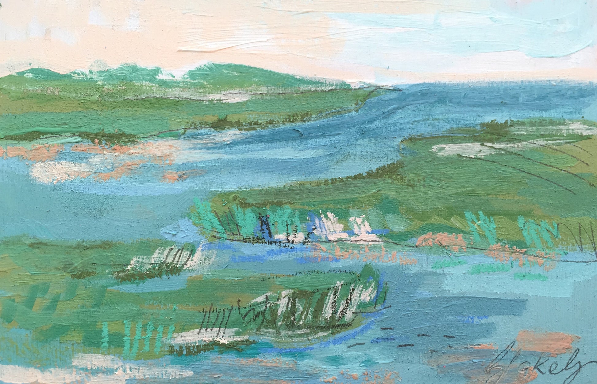This piece is an original marsh painting from August 2016. It is made with acrylic paint, neocolor crayons, pencil, and oil pastel on a birch wood panel. The sides have a two inch depth and will be painted white. It is signed by the artist and will be shipped from Charleston, SC via UPS.