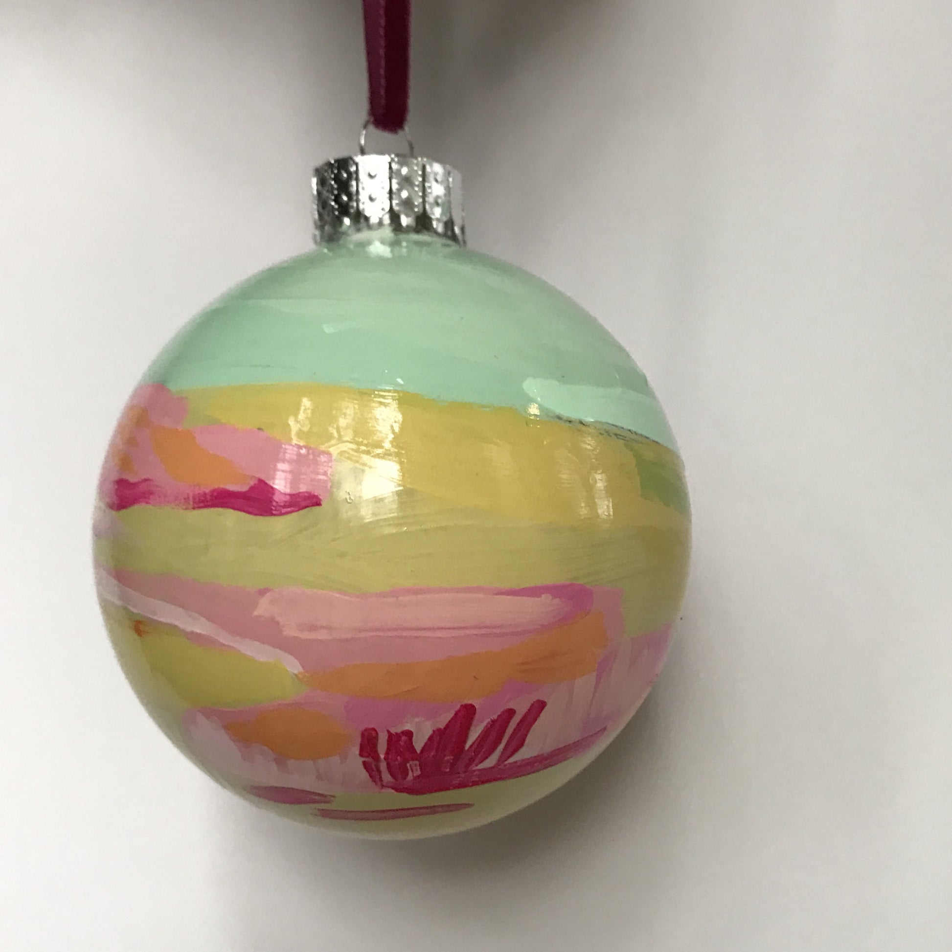 This ornament was hand painted by Blakely on a glass Christmas ball with acrylic paint. Each ornament is 3 inches in diameter, and strung with a velvet ribbon.