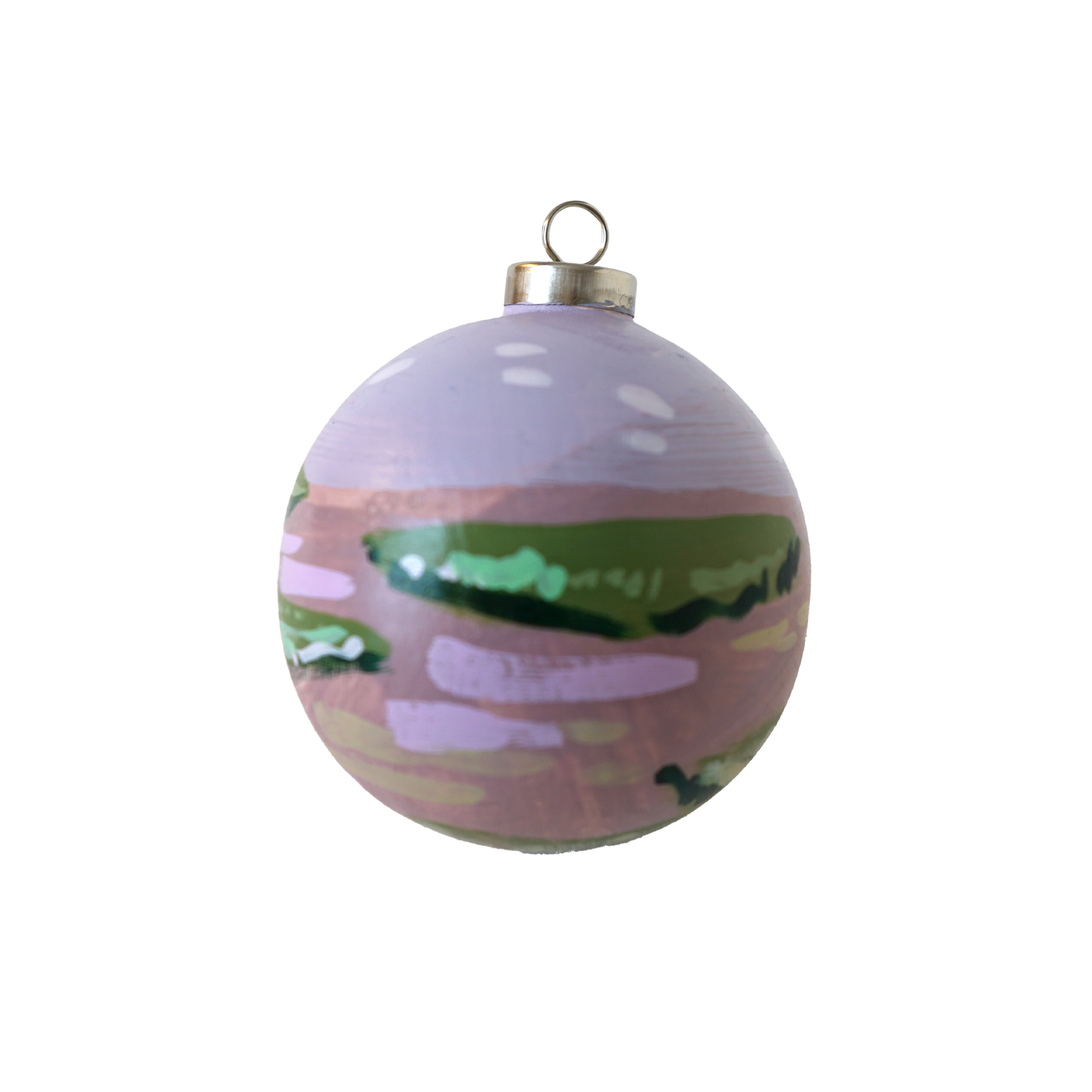 This ornament was hand-painted by Blakely on a glass Christmas ball with acrylic paint. Each ornament is tied with a velvet ribbon.