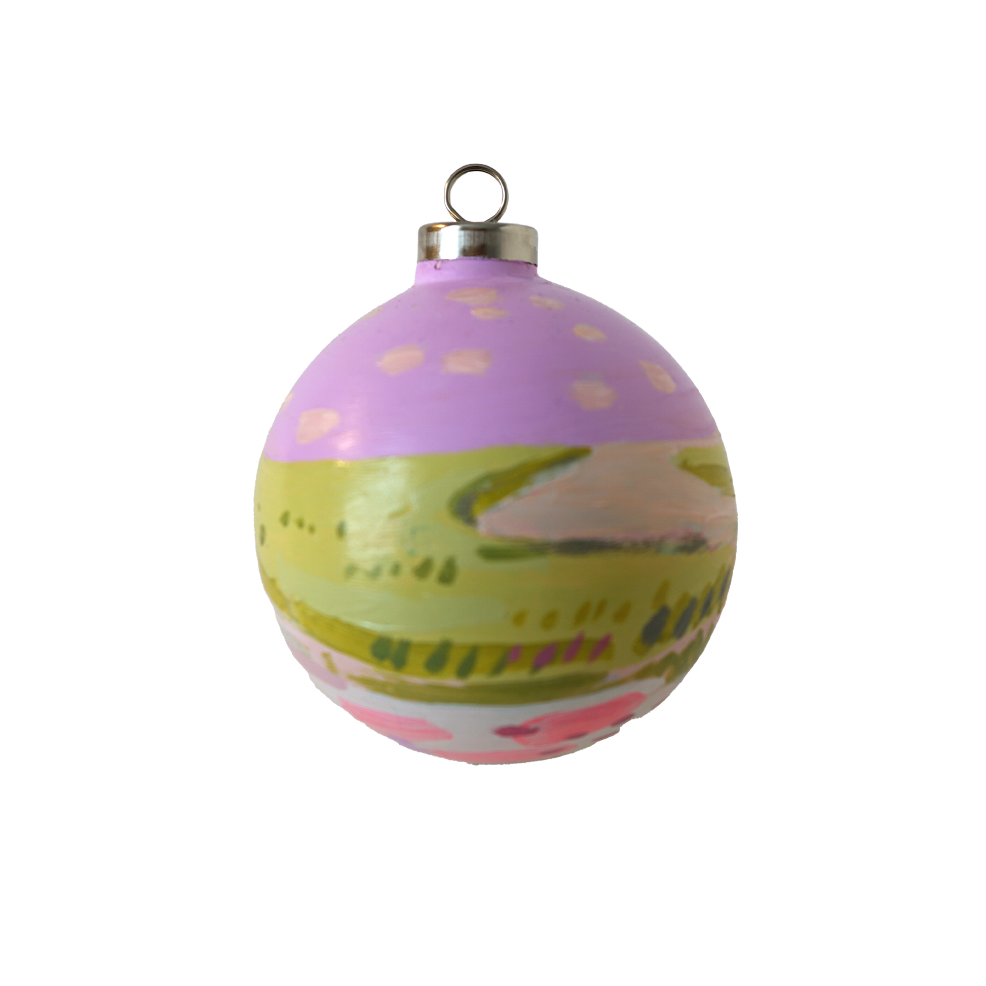 This ornament was hand-painted by Blakely on a glass Christmas ball with acrylic paint. Each ornament is tied with a velvet ribbon.
