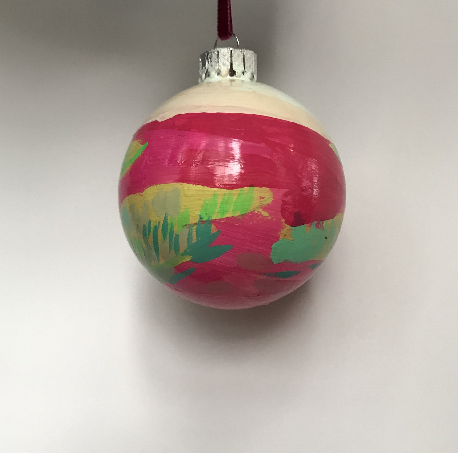 This ornament was hand painted by Blakely on a glass Christmas ball with acrylic paint. Each ornament is 3 inches in diameter, and strung with a velvet ribbon.
