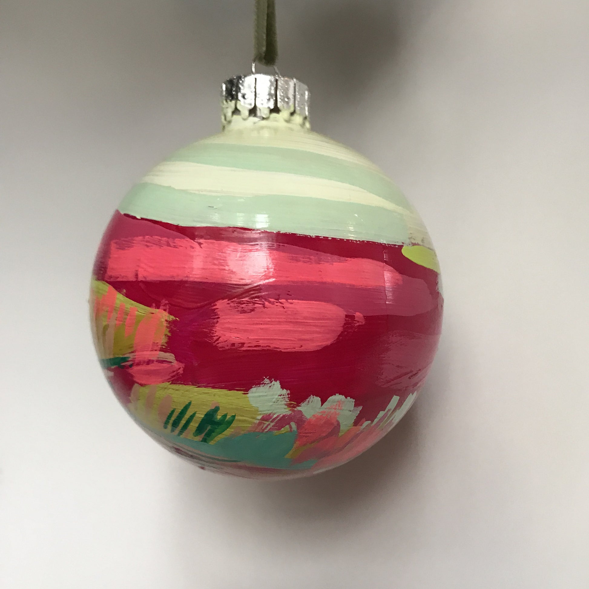 This ornament was hand painted by Blakely on a glass Christmas ball with acrylic paint. Each ornament is 3 inches in diameter, and strung with a velvet ribbon.