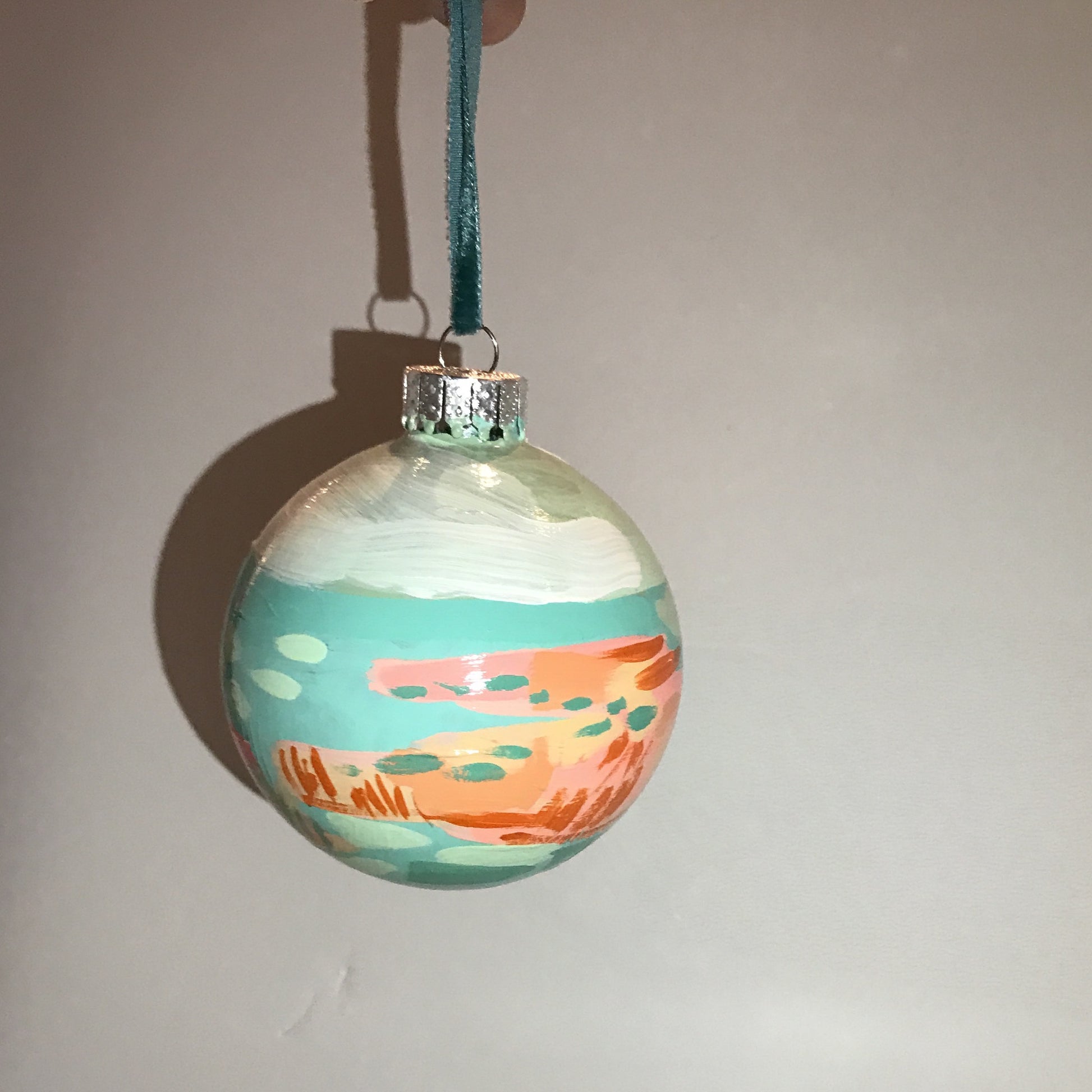 This ornament was hand painted by Blakely on a glass Christmas ball with acrylic paint. Each ornament is 3 inches in diameter, and strung with a velvet ribbon.
