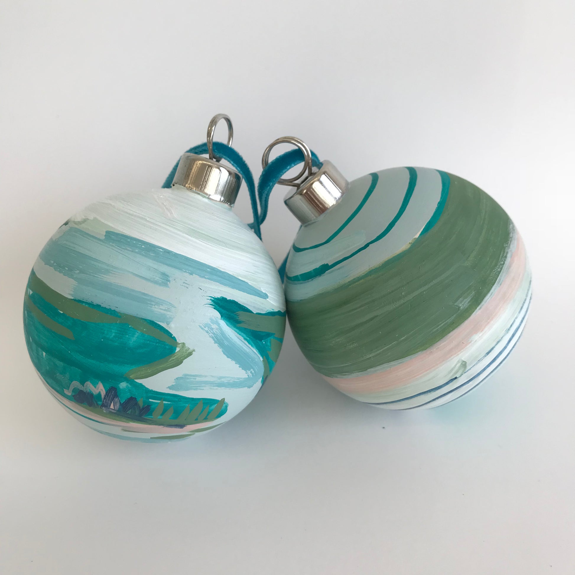 Each ornament was hand painted by Blakely. They are ceramic ornaments with a circumference of 3.5 inches, and will be tied with a velvet ribbon. The collection will be shipping from Charleston, SC via USPS. Order before Dec. 20 to recieve in time for Christmas.
