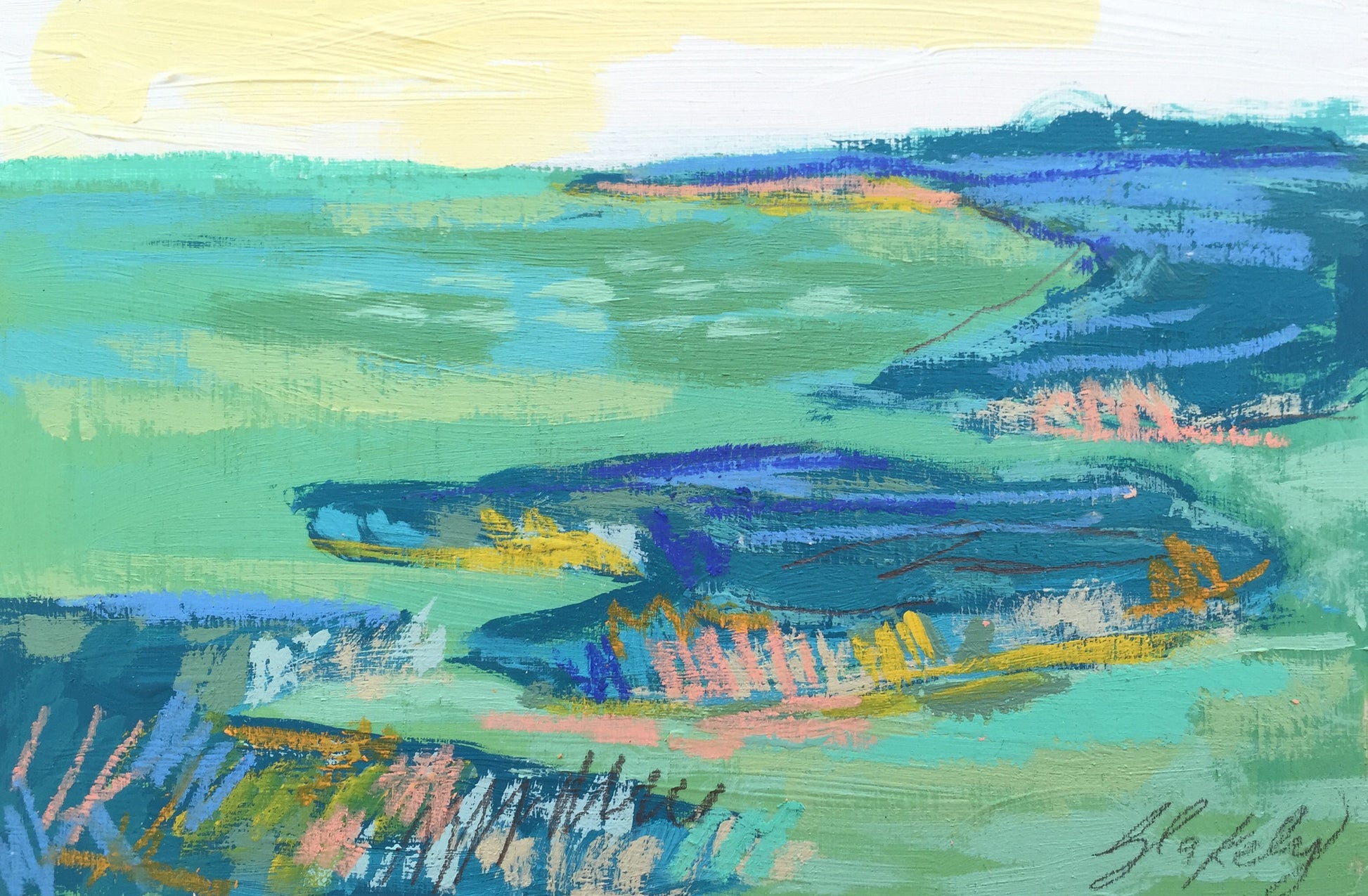 This piece is an original marsh painting from August 2016. It is made with acrylic paint, neocolor crayons, pencil, and oil pastel on a birch wood panel. The sides have a two inch depth and will be painted white. It is signed by the artist and will be shipped from Charleston, SC via UPS.