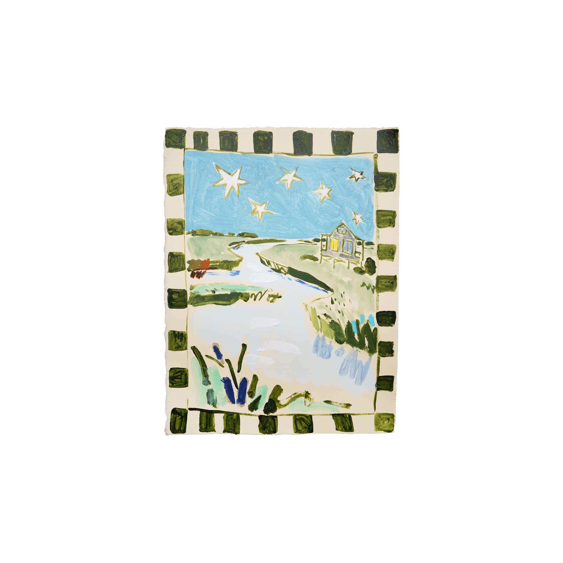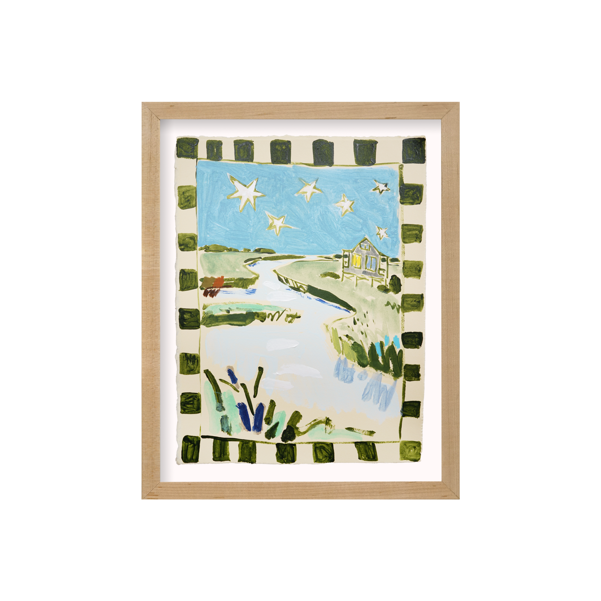Acrylic, pencil, and wax pastel on BFK Rives 280gsm paper floated in an optional Natural Wood Floated Frame