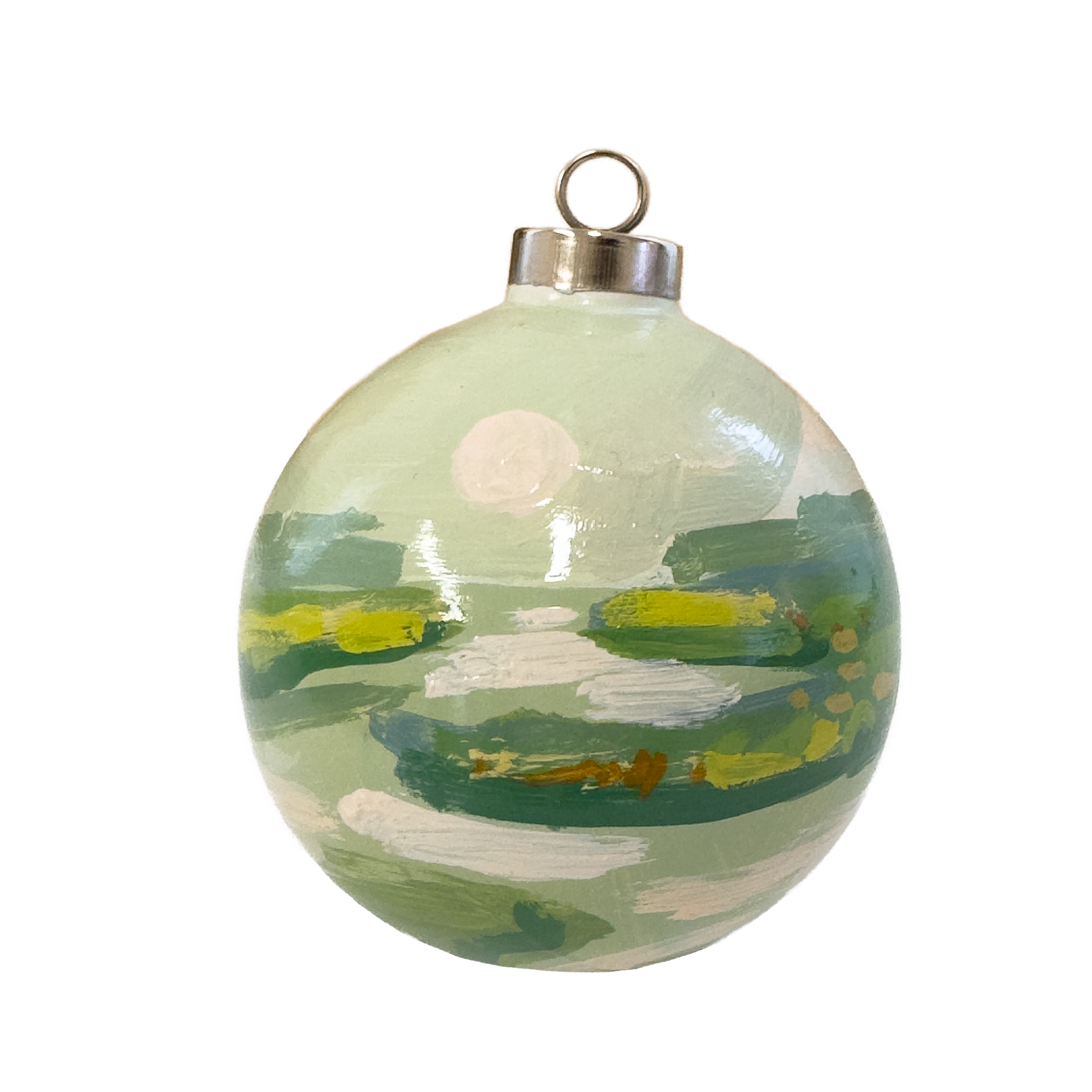 This ornament was hand-painted by Blakely on ceramic with acrylic paint. Each ornament is 3 inches in diameter and tied with a ribbon.