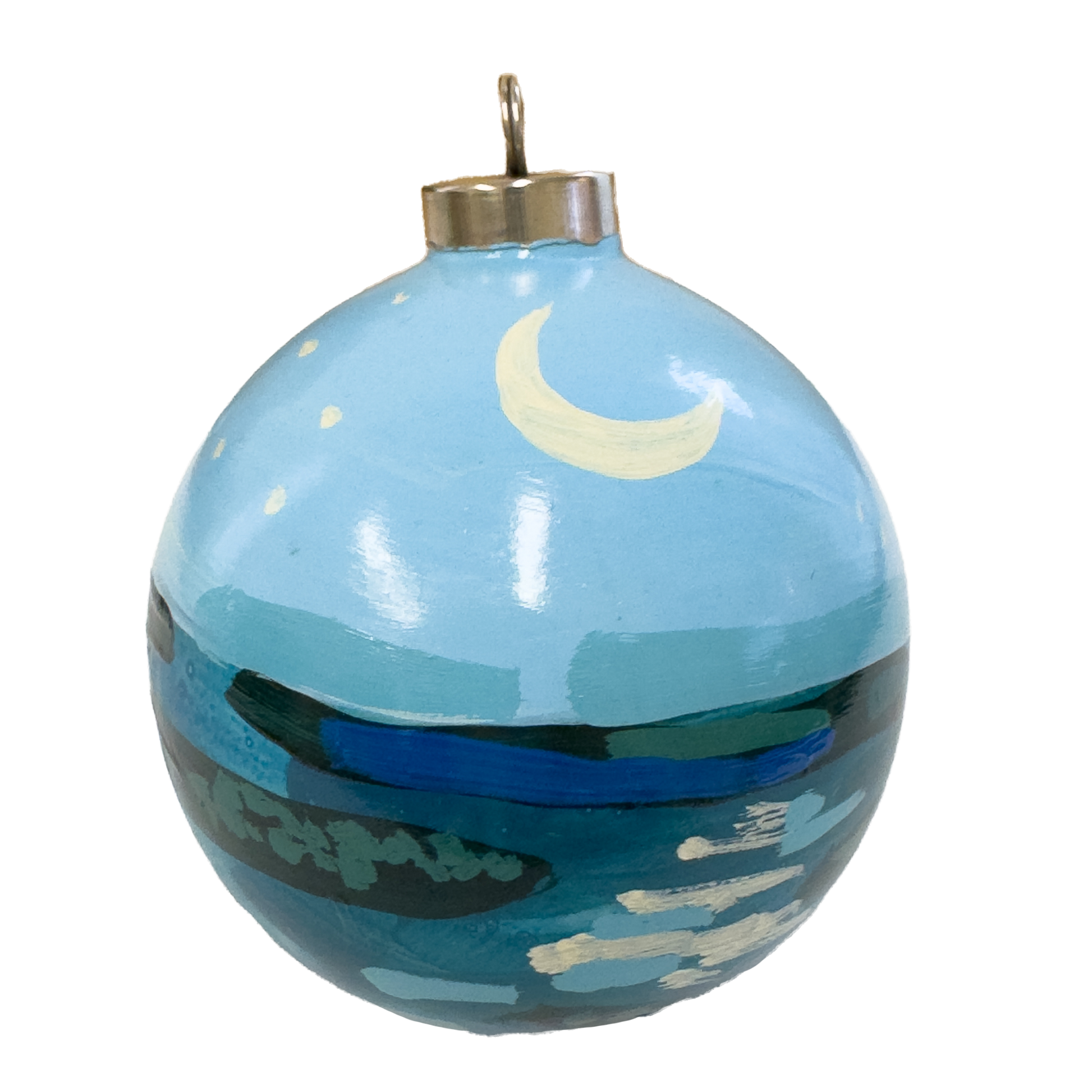 This ornament was hand-painted by Blakely on ceramic with acrylic paint. Each ornament is 3 inches in diameter and tied with a ribbon.