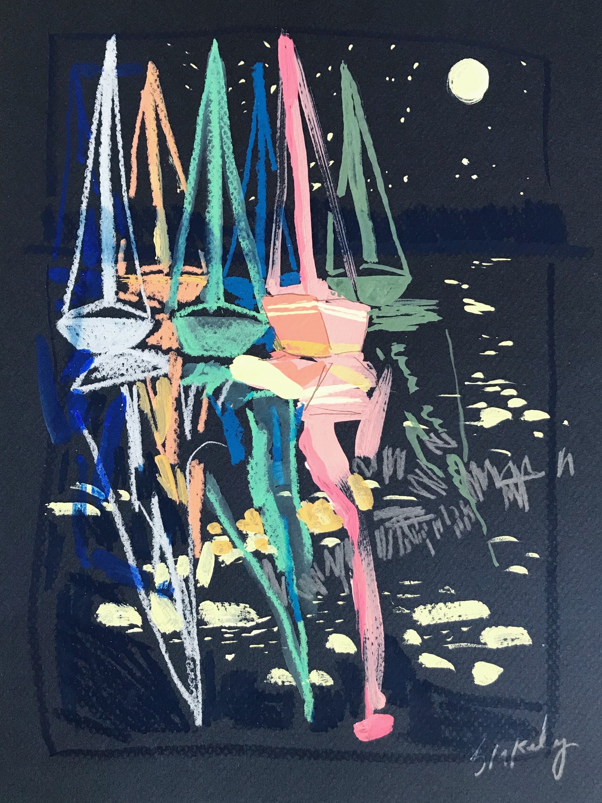 This piece is gouache, acrylic paint, pencil, and pastel on navy blue paper. It will be sold unframed, and hand signed by Blakely. Piece will ship from Charleston, SC via UPS.