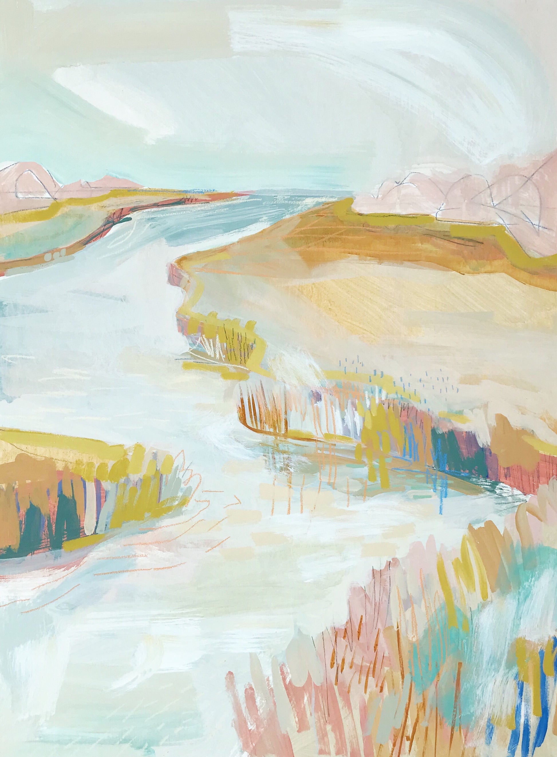 Blakely is best known for her bold colored marsh paintings. Each piece is inspired by the sprawling marsh along the East Coast. This painting was created with acrylic paint, oil pastel, neocolor crayon, and pencil on a birch wood panel. The depth the panel is 1.5 inches and it will be painted white. Paintings ship from Charleston, SC via UPS.