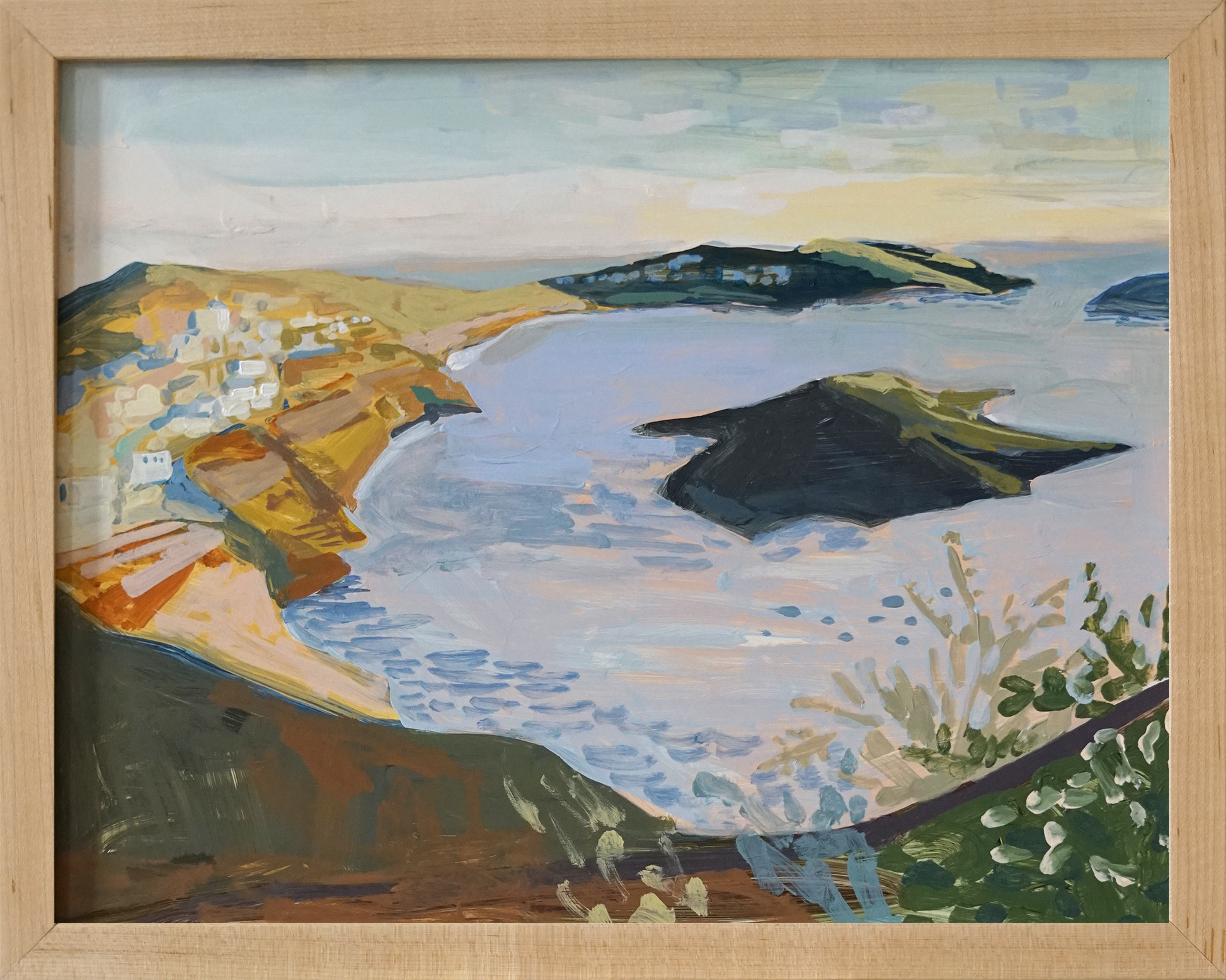 Acrylic on flat panel with a maple wood frame